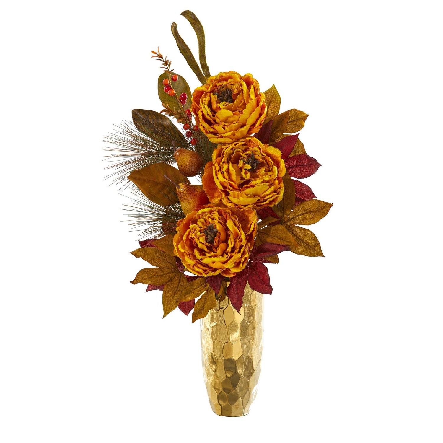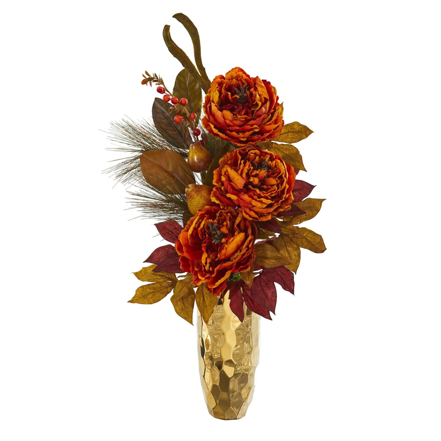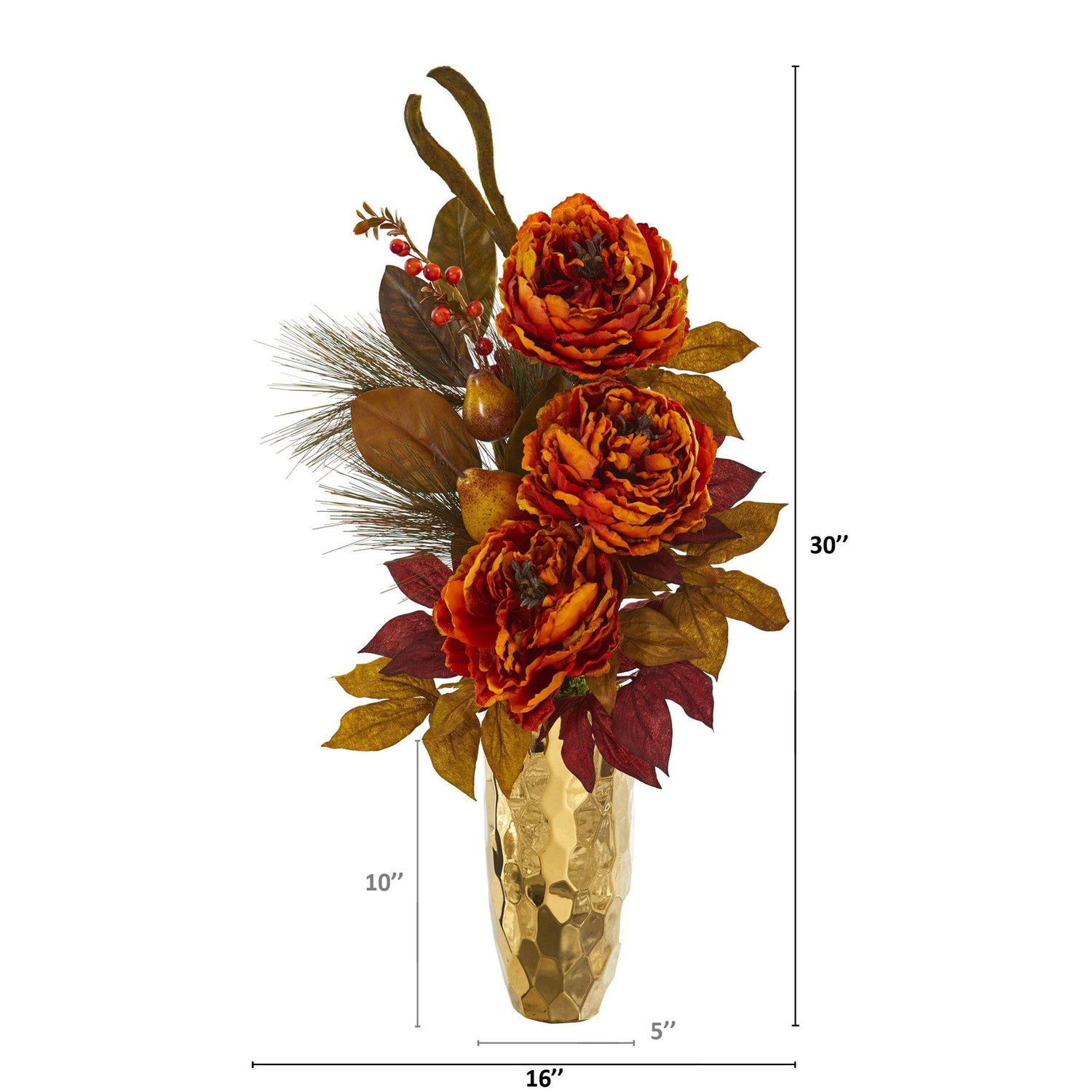 Update seasonal decor with this autumn-inspired artificial arrangement boasting a collection of intricately designed peony blossoms in natural dark hues, contrasted against complementary magnolia leaves and carefully accented throughout with pears and pine. Standing 30” high from a gold vase, this handsome silk arrangement would easily elevate an office or reception space just in time for the holidays.