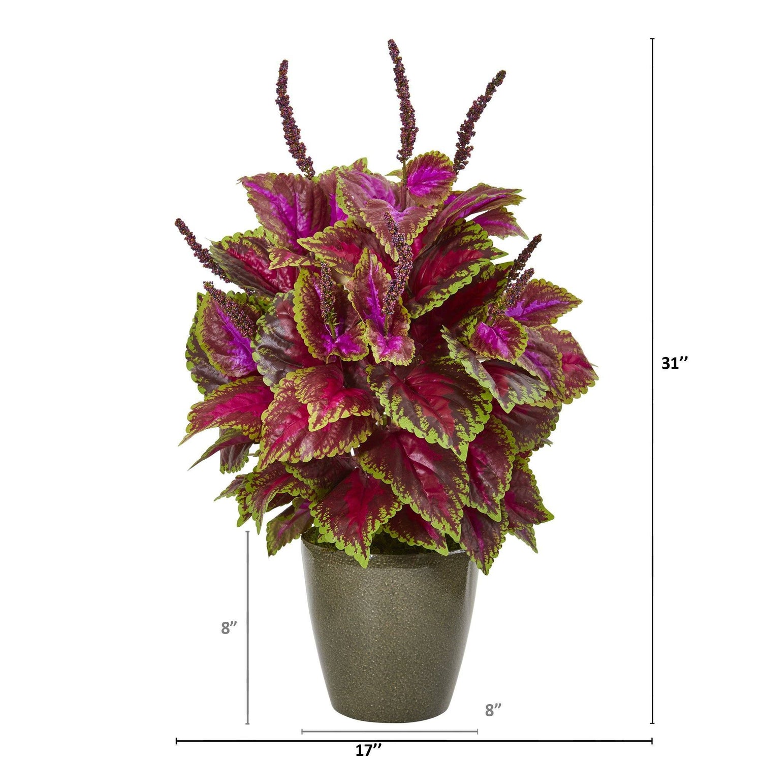Showcase explosive coloring throughout your home interiors with this authentic looking artificial coleus plant. Flaunting bright vivid leaves with natural occurring details, this dramatic plant will instantly transform bare, ordinary spaces; reaching 31” high from a green planter, it makes for a handsome doorway accent.