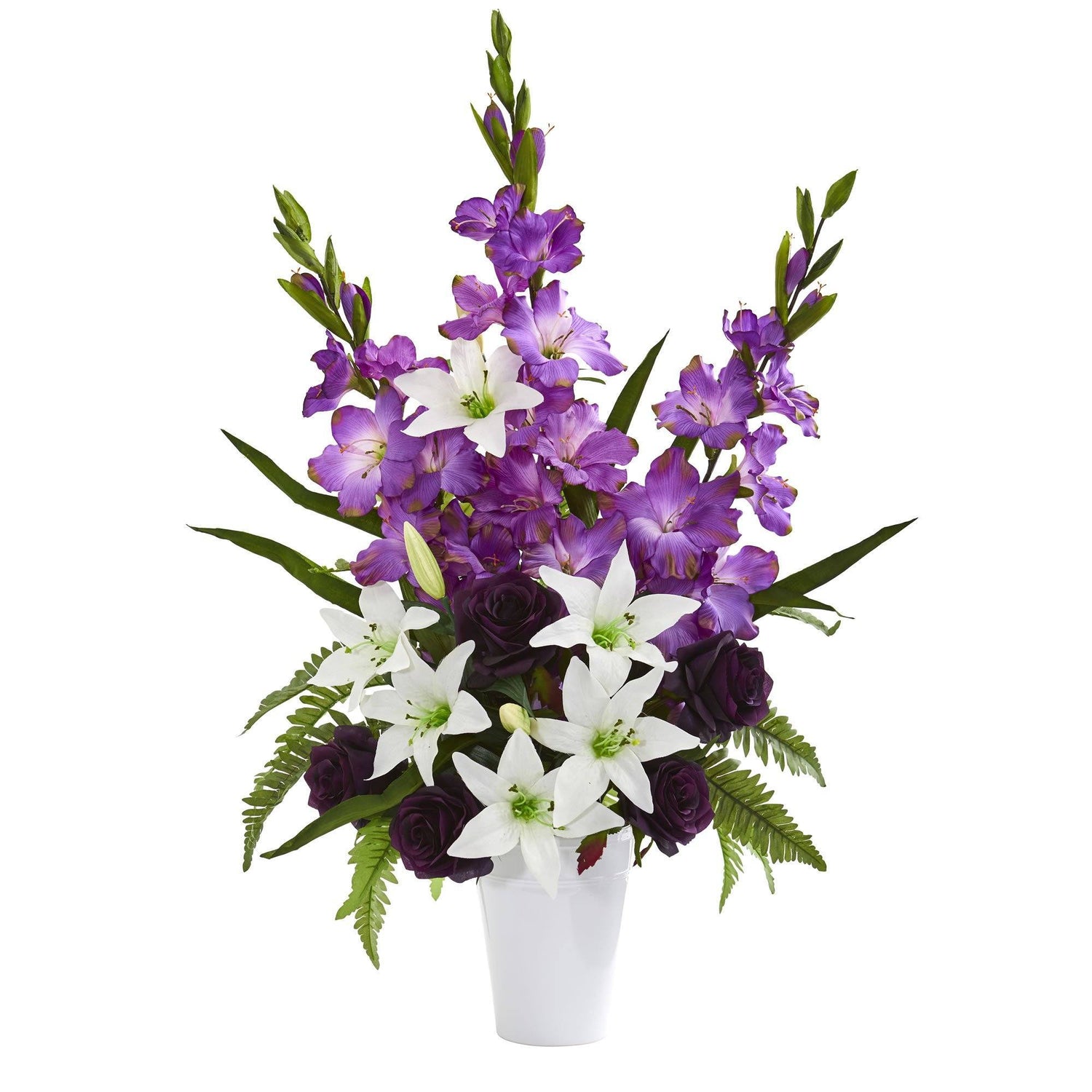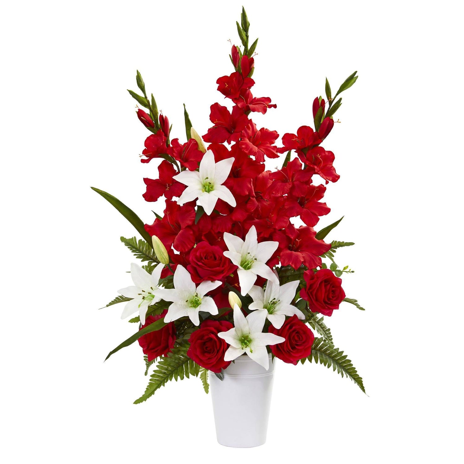 Bursting forth from a crisp white vase, this elegant arrangement contains long rich ferns combined with brilliant, lifelike artificial lilies, roses and gladiolas flowers that come in various colors. It will provide any room with an intense splash of color. Sit this 31-inch artificial mixed flowers arrangement on your kitchen island with other white or light red vases and ornaments for a polished look.