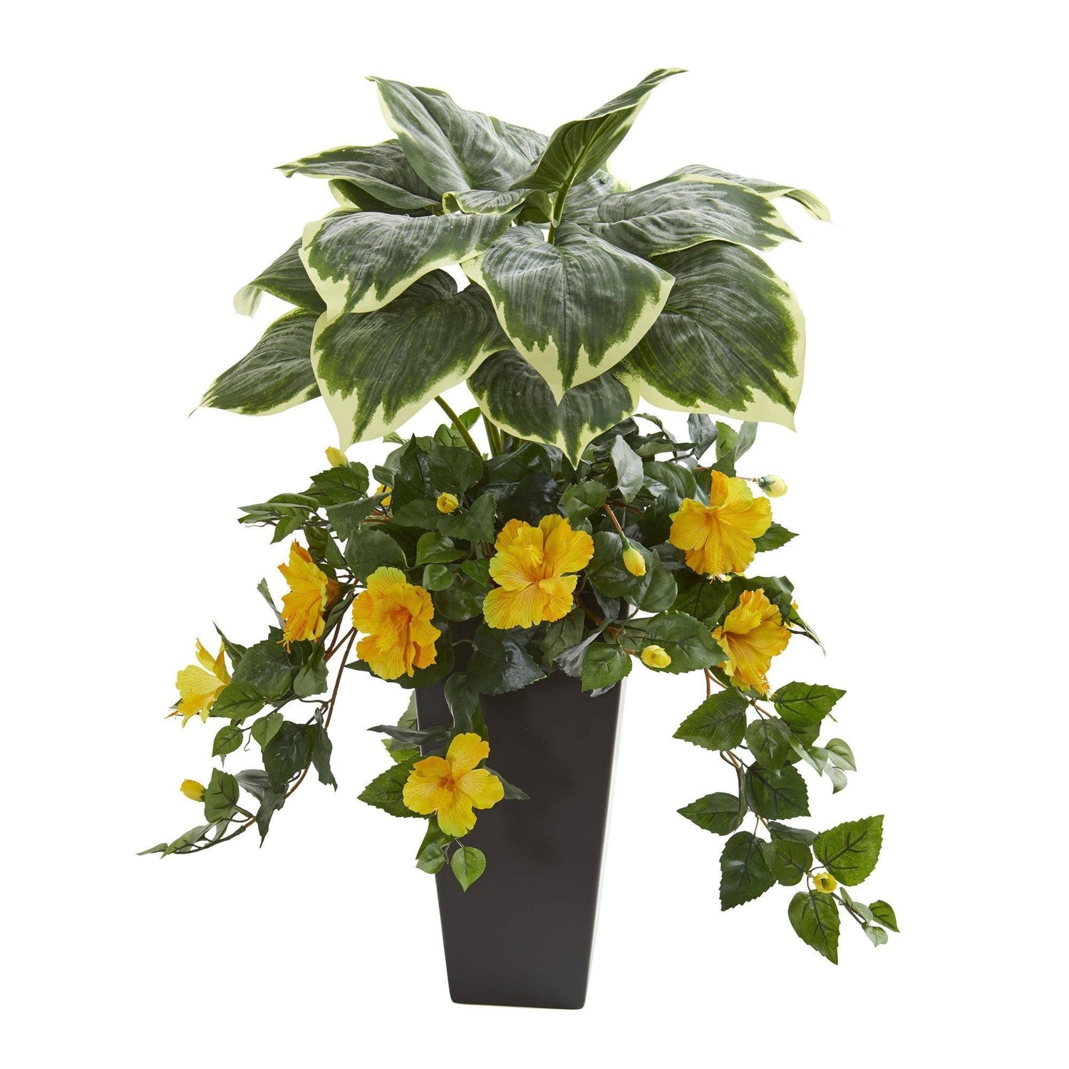 The large variegated green foliage of the hosta and hibiscus artificial plant overlaps and hovers above vibrant yellow blooms and green leaves that cascade out of the minimal black vase. With its vibrant appearance, this 32-inch ornament would make a statement anywhere you put it. Try placing it on a built-in wall shelf or end table with other wooden decor for a more earthy finish.