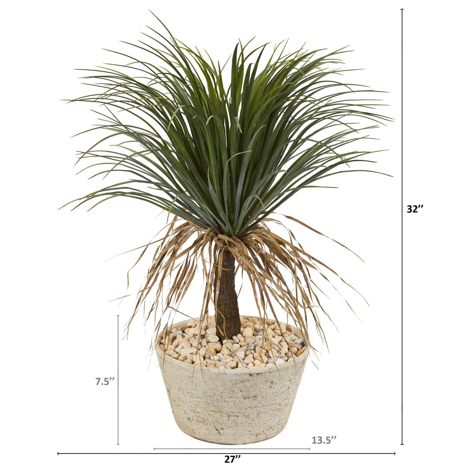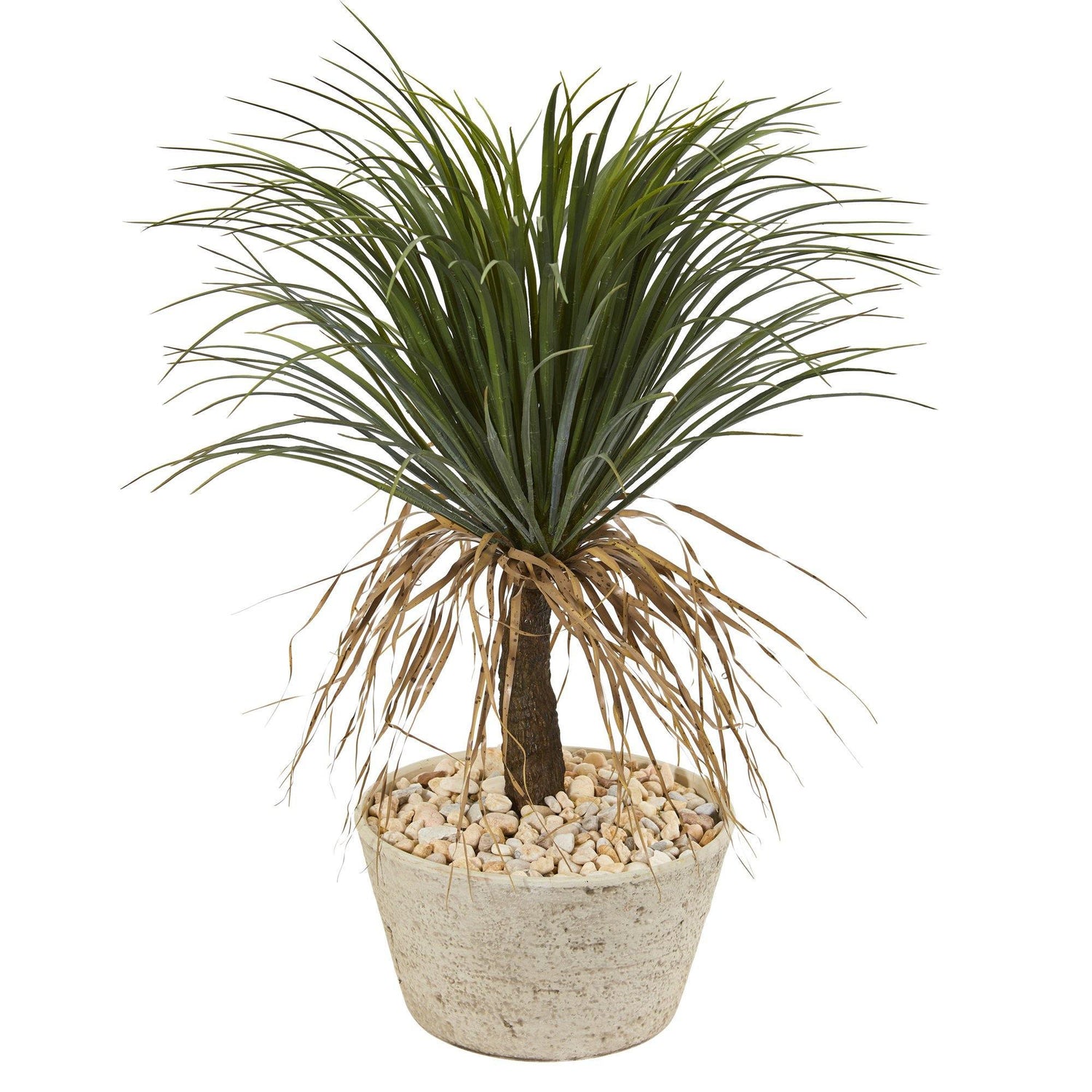 Bring life into bare, empty spaces with the help of this artificial plant showcasing sharp shoots of ponytail palm greenery in a palette of year-round evergreen. Standing 32” high from a white planter accented with natural tone rocks, this fake succulent adds refreshing texture and color to everyday surroundings.