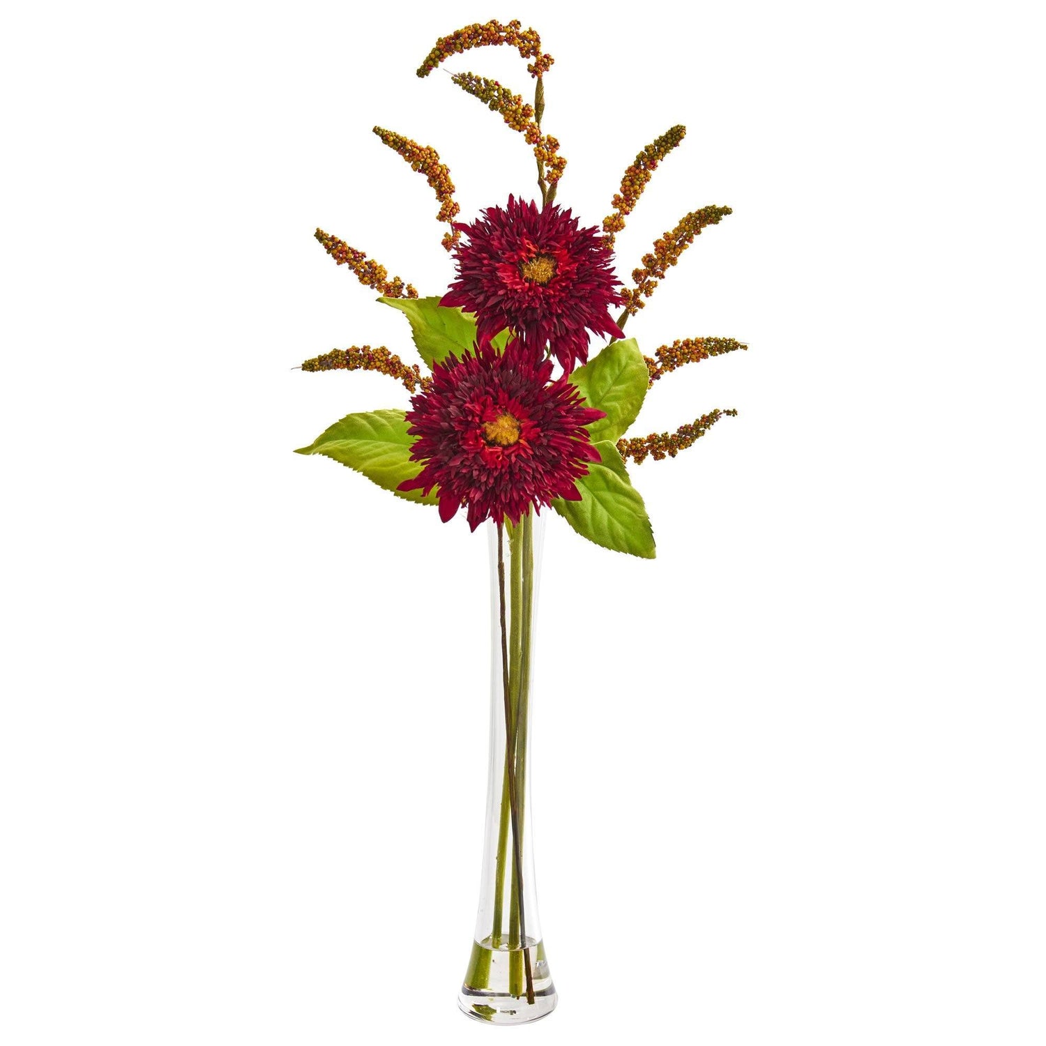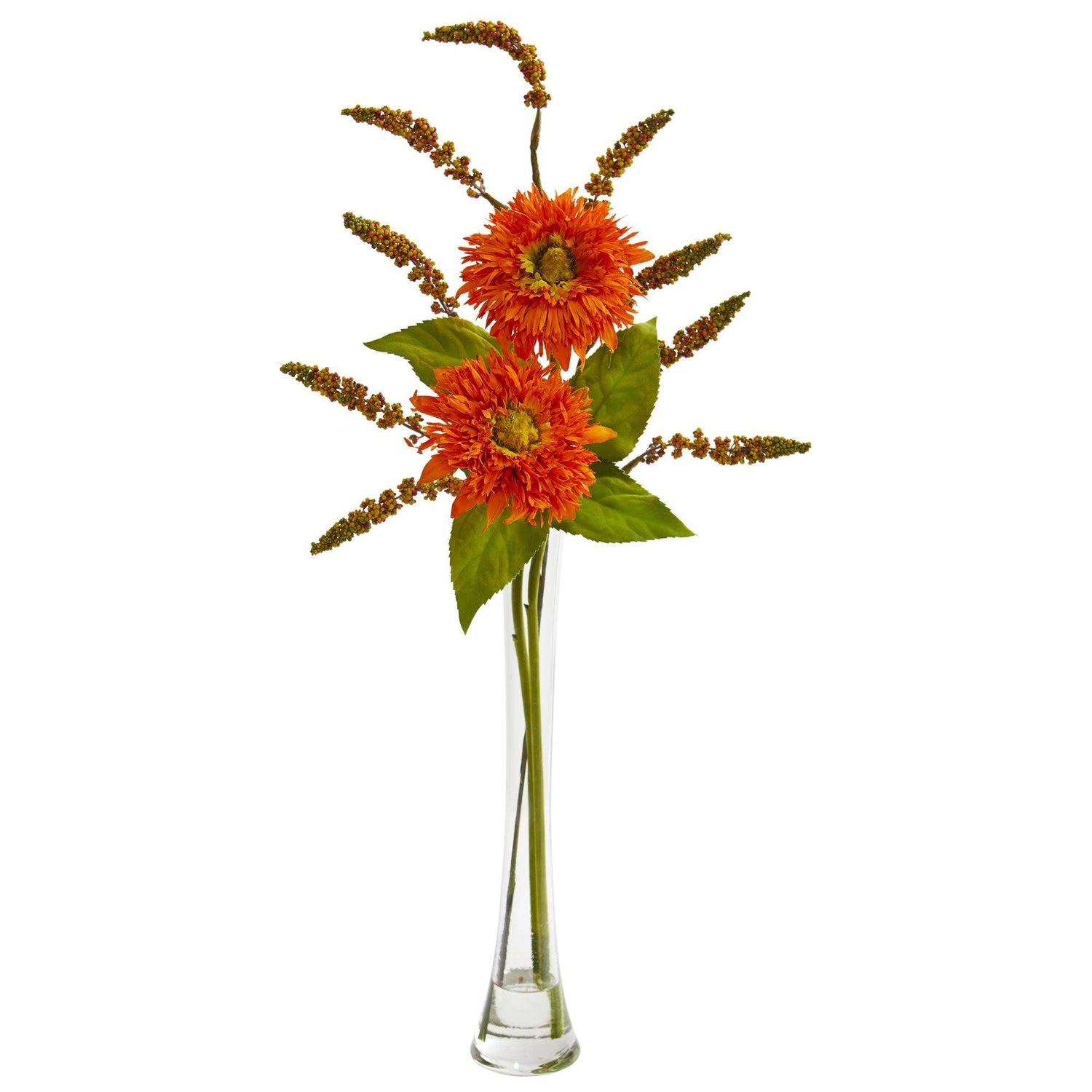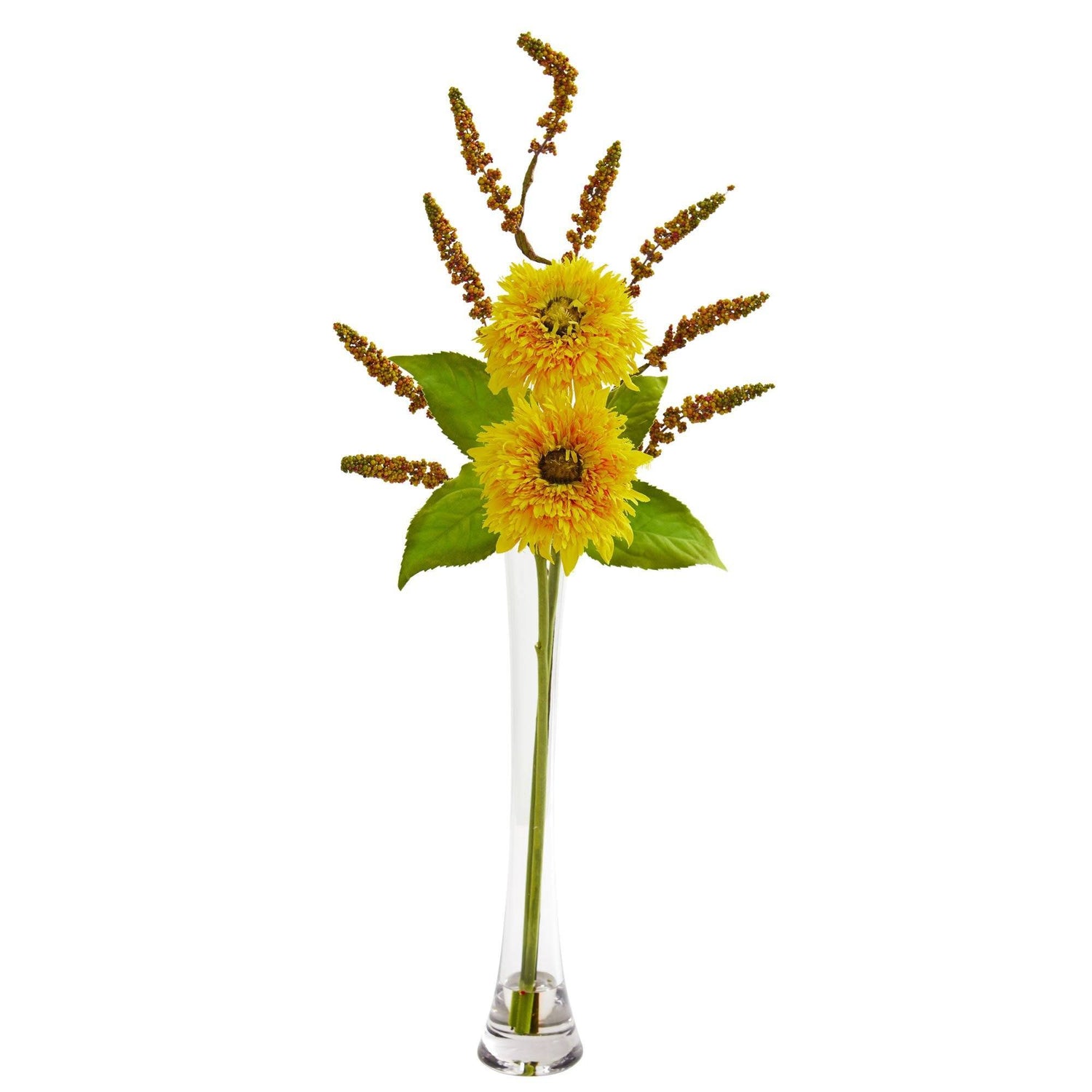 Add a burst of sunshine to your home or office space with this artificial sunflower. The cheery bloom and delicate foliage are gently hanging over the edge of the included elegant pillar glass vase. Set this ornament as a centerpiece on your dining table and position it next to a marble bowl filled with real or faux fruit for a complete look. The 32-inch height of this ornament is also perfect for end tables, night stands, and other tight spaces.