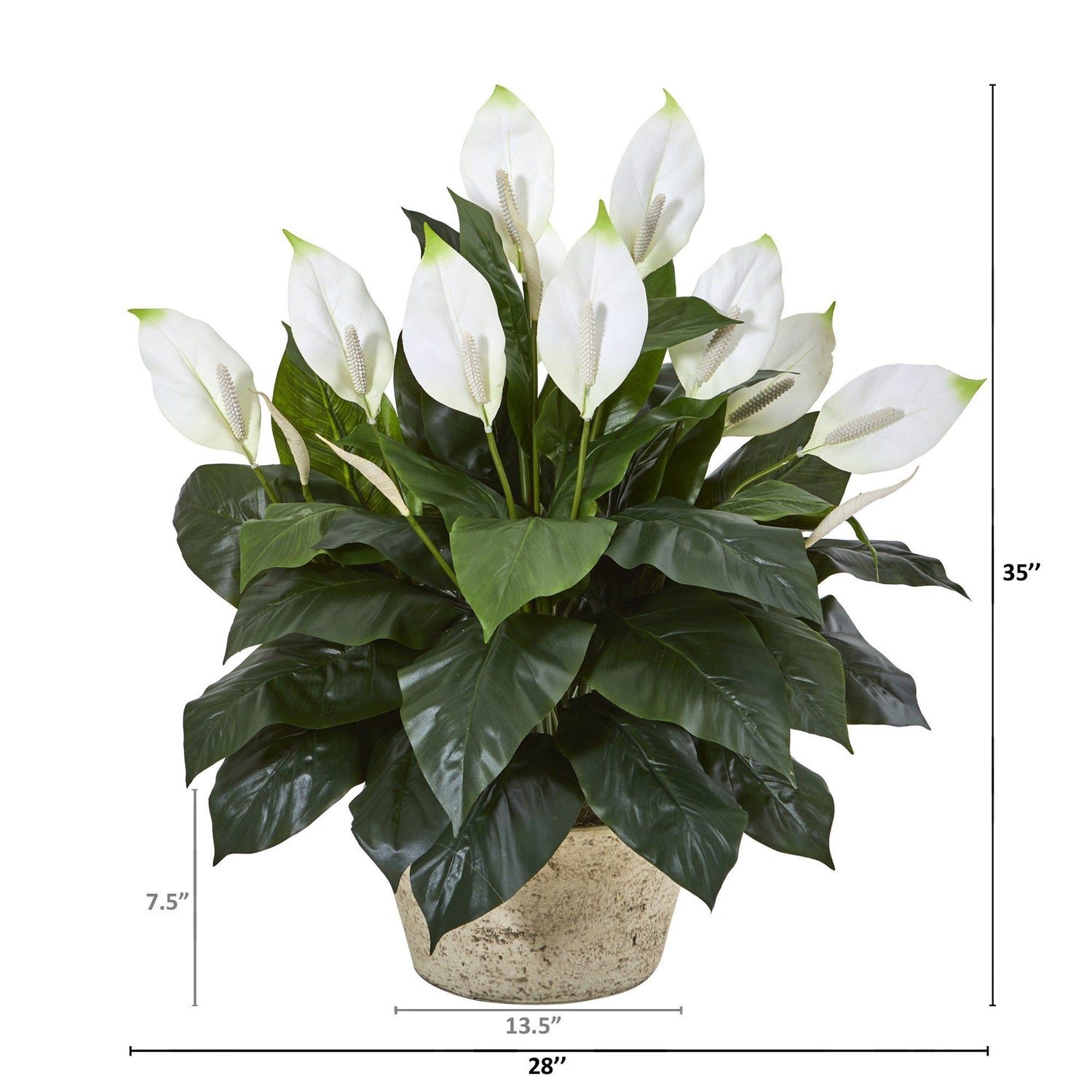 Add a classic accent to home interiors with this artificial spathiphyllum plant boasting countless dark leaves highlighted with realistic silk blooms look real to the naked eye. Standing 35” tall from a white planter, it brings impactful greenery to empty spaces.