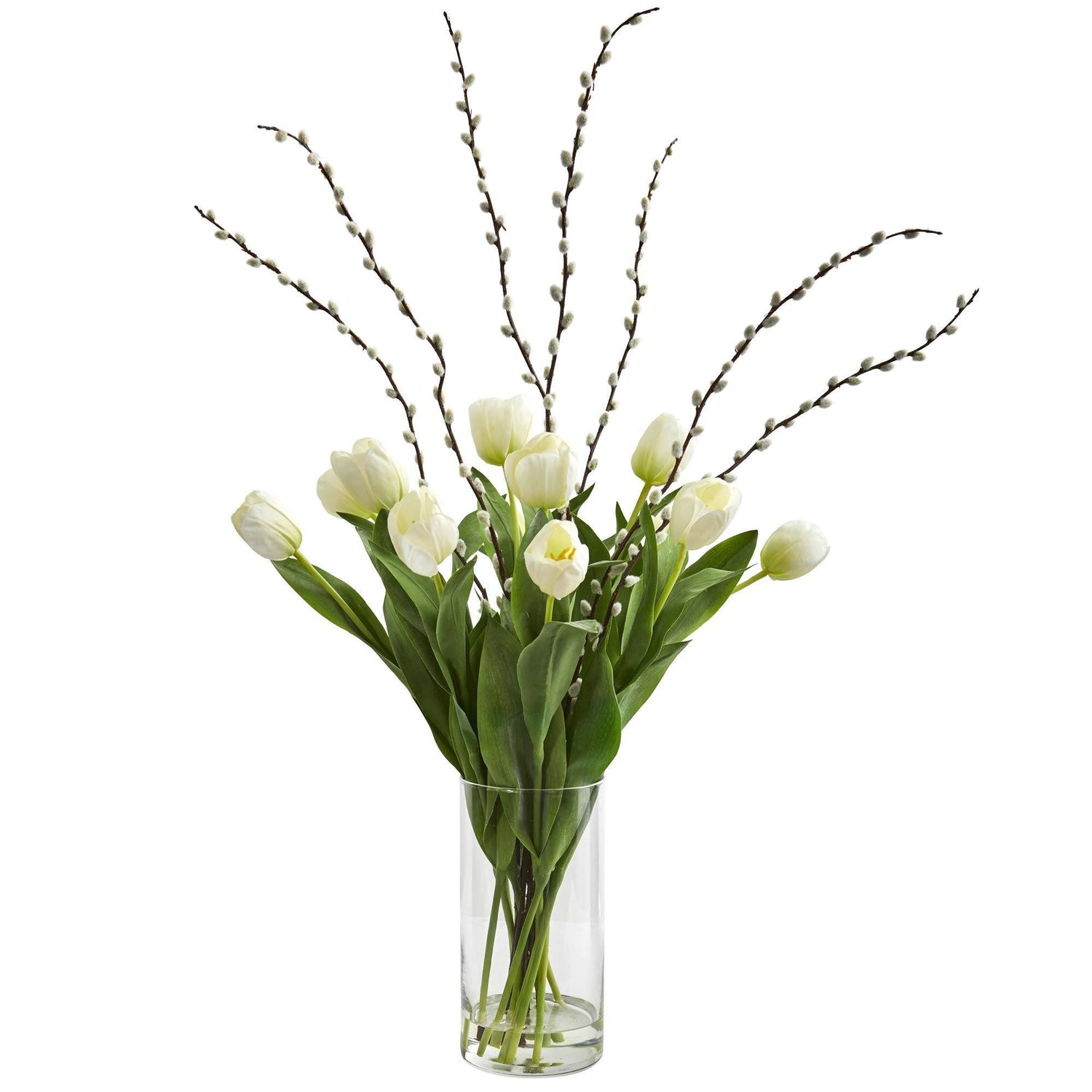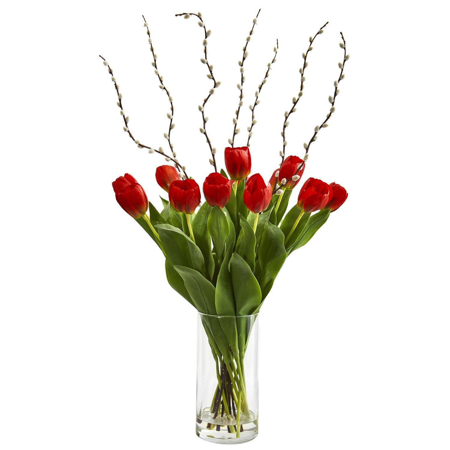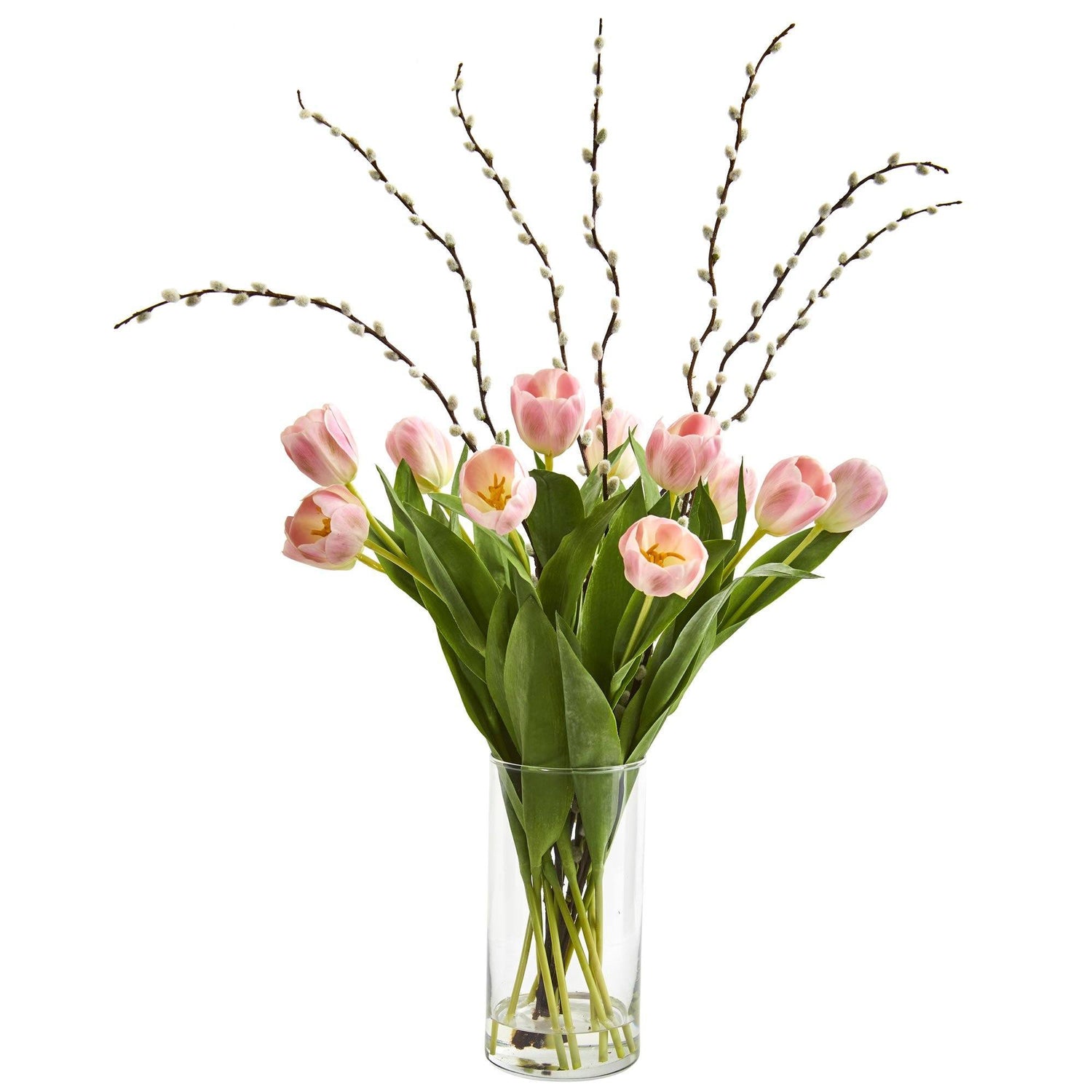 Featuring a splay of gorgeous tulips sprouting from their long stems with realistic leaves, this tulips artificial arrangement will make an eye-catching centerpiece, while they rest in their own clear cylinder vase. Place this arrangement on a table runner on your dining room table for a simple yet beautiful centerpiece. Or, you can buy two and place one on your vanity and one on your dresser for a coordinated look.
