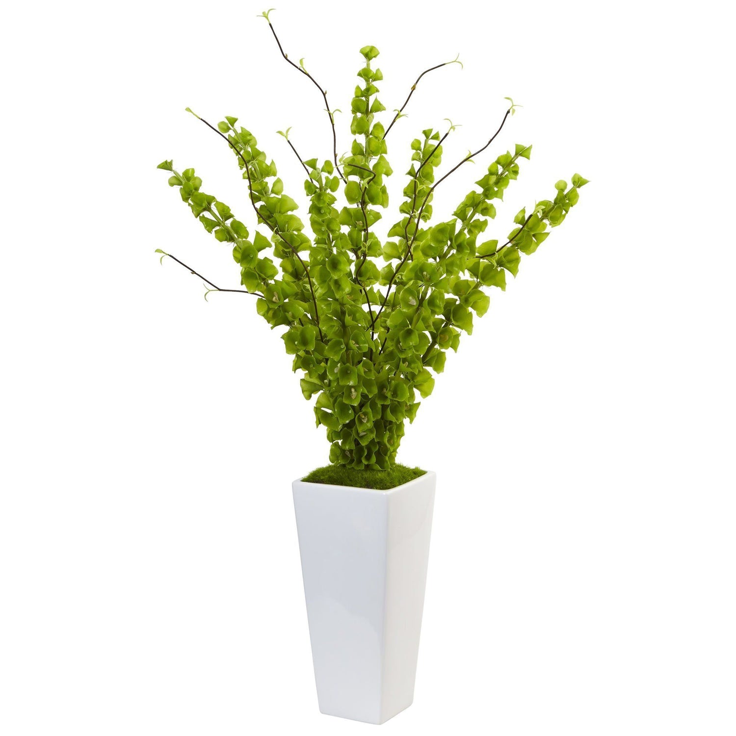 These delicate faux bells of Ireland rise gently up from a sleek white taper planter. At 36 inches, it's the ideal size to be a dramatic centerpiece, or to stand on its own next to a fireplace or window. Enjoy this versatile faux plant for years to come.