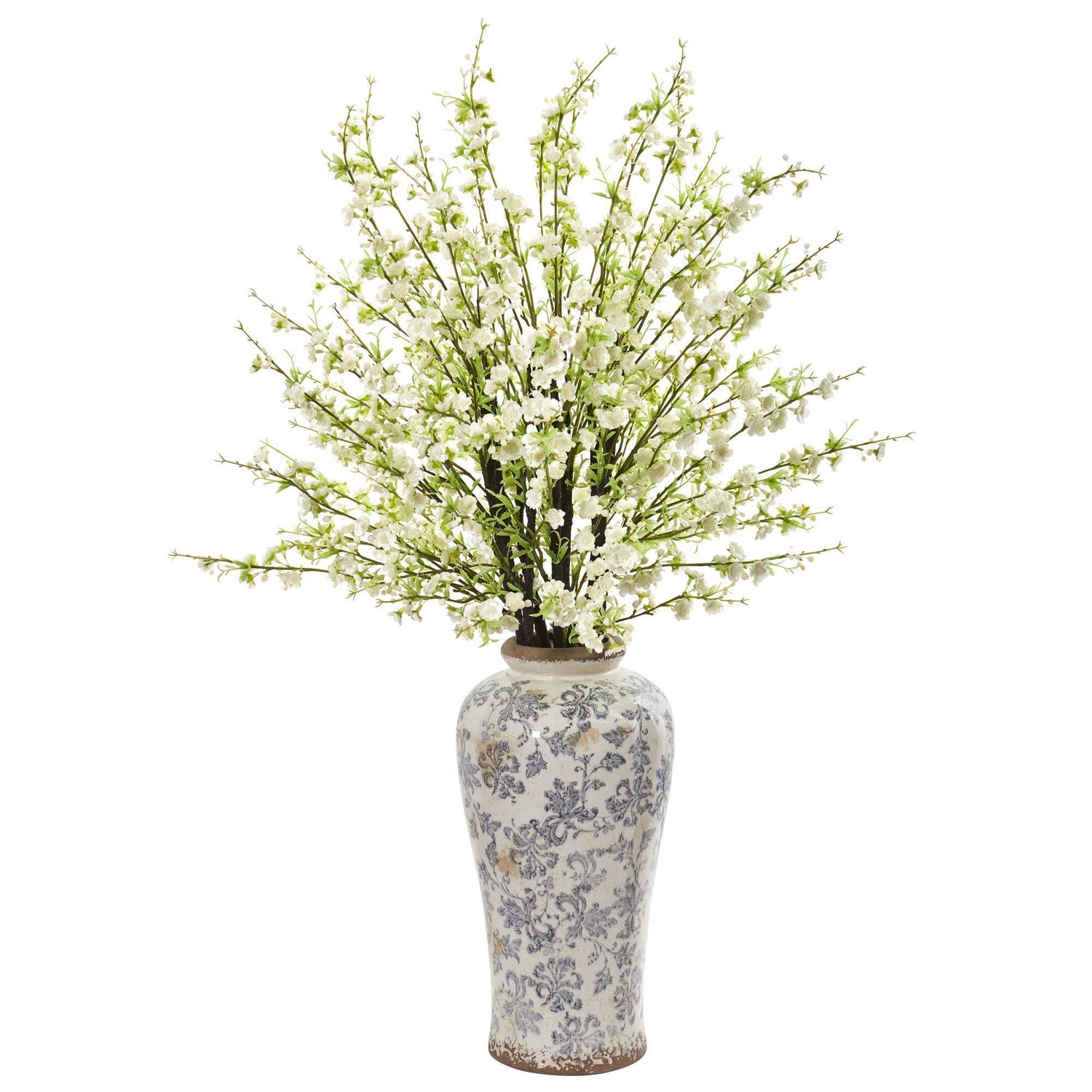 Many wispy stems filled with delicate blooms fan out gracefully atop a decorative vase with this cherry blossom artificial arrangement. Bring this stunning piece inside your home to welcome in a spring vibe all year long. To complete the look, allow other faux flowering plants to be settled in tall vases and placed upon a few accent tables across any room to create a long-lasting, fresh and bright atmosphere.