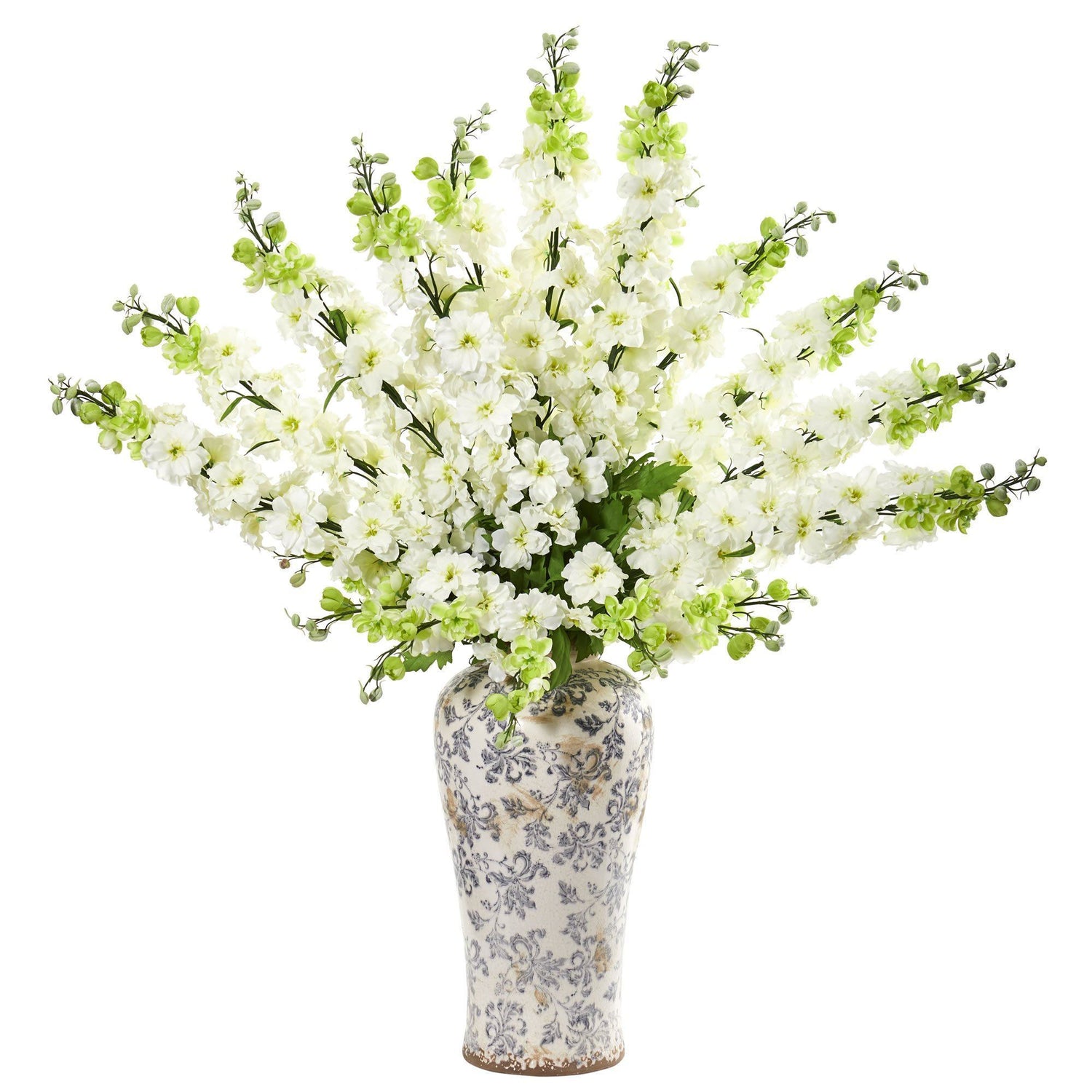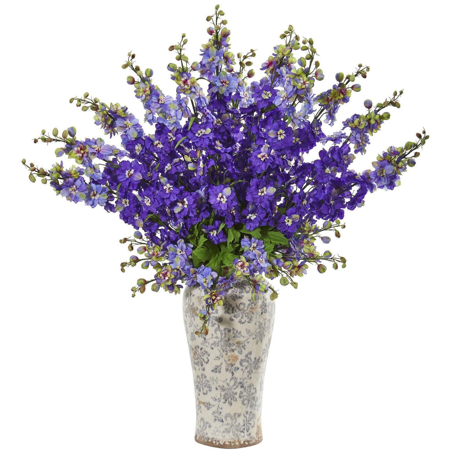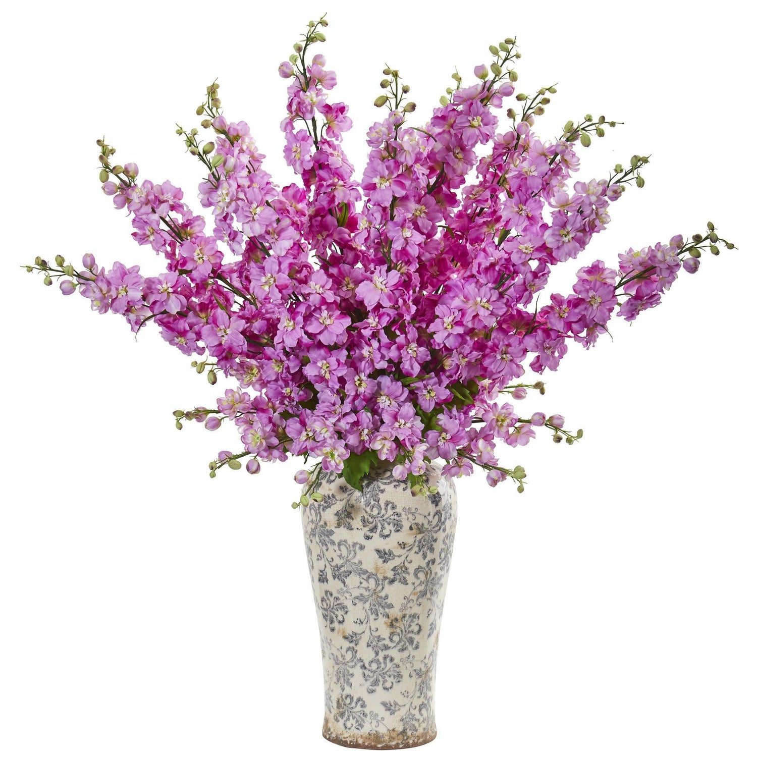 Standing at 38 inches tall, the artificial delphinium arrangement contains expertly trimmed lush blooms that tower over the included beautiful printed vase. Sporting a lively color, this would make a great addition to a modern-themed bathroom. To finish off the look, position it on the counter near your apothecary jars or canisters that are filled with cotton balls, swabs, and cosmetic pads to create a spa-like ambiance.