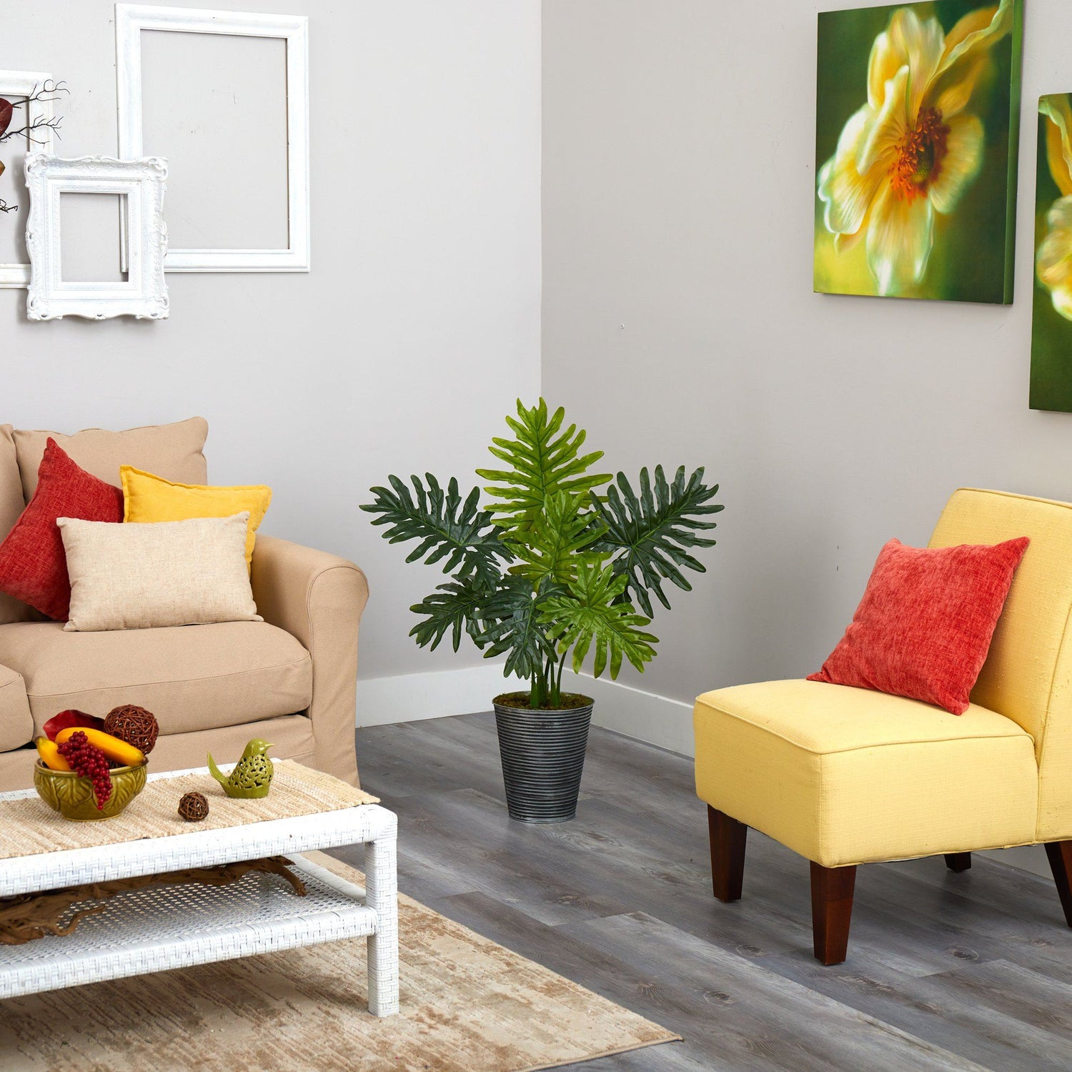 Elevate your favorite space with the year-round greenery provided by this artificial philodendron plant; boasting a large overgrowth of realistic looking fronds, this tropical-inspired fake plant is intricately designed in vibrant, bright hues and with naturally occurring details that feel real to the touch. Standing 38” high and carefully stabilized in a decorative tin planter, this handsome indoor plant would provide instant freshness wherever displayed.