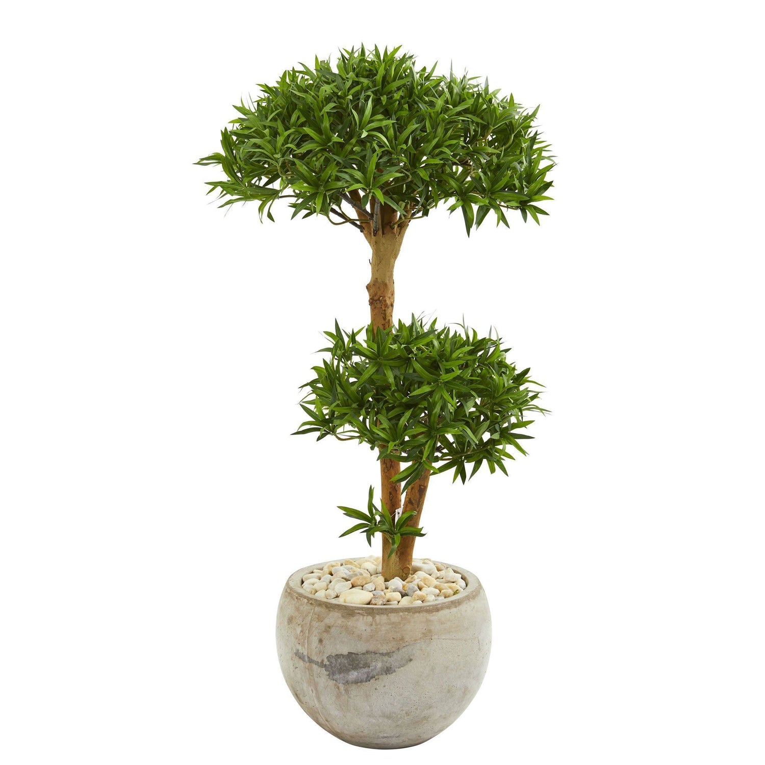 The artificial bonsai styled podocarpus tree has two sturdy brown stems that reveal two heads of lush, bright green foliage's. With the brilliant coloring of green foliage's, included tower planter and river rocks, this ornament can easily blend with any home arrangement. Position it next to a window, enclosed patio door, or a neutral-toned couch. Add some decorative throw pillows with floral print onto the couch to sport a sophisticated look.