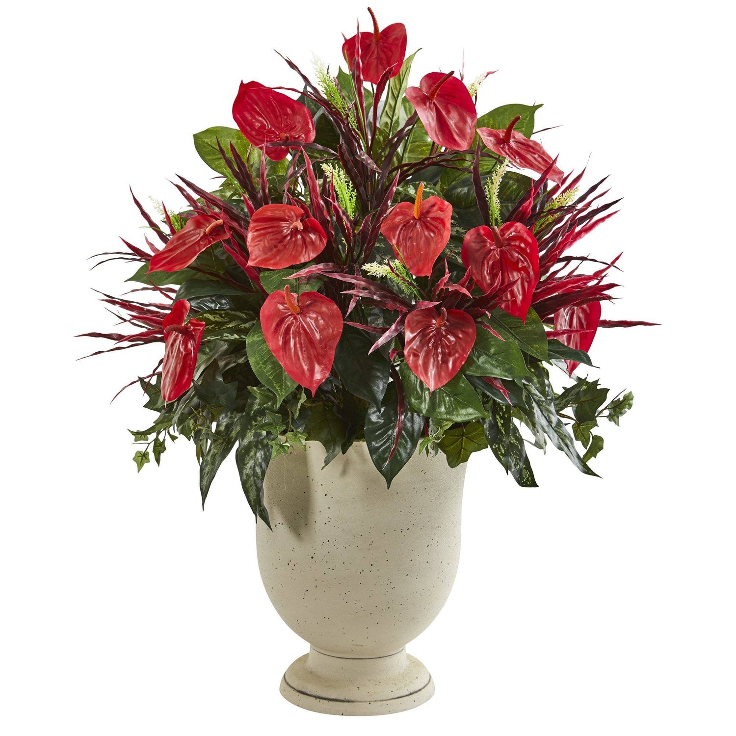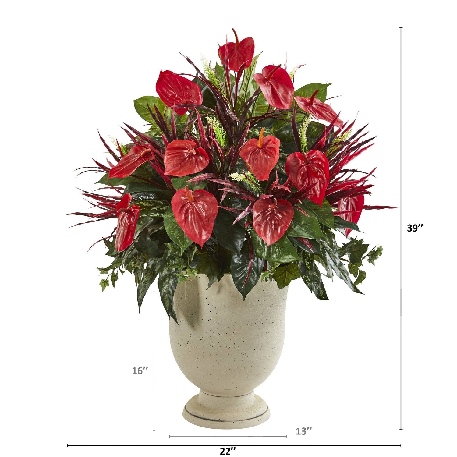 Transform bare, boring spaces with the help of the explosive coloring pouring forth from this artificial plant boasting several, realistically designed anthurium blooms in vivid hues, handsomely accented with complementary greenery. Standing 39” high from a decorative urn, this artificial plant would provide instant freshness wherever displayed.