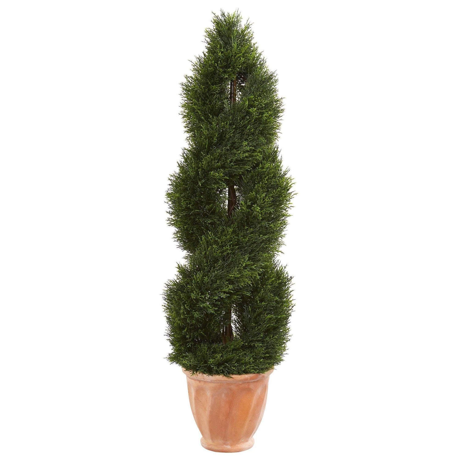 Two spirals of lush, realistic green foliage encircle each other, dancing around a lifelike stem. This artificial double spiral cypress topiary tree is expertly made and looks authentic in its terracotta planter. Add some warmth to your dining room by placing this under a hanging light or in a corner by a window. It's also perfect for decorating your outdoor patio or front entranceway.