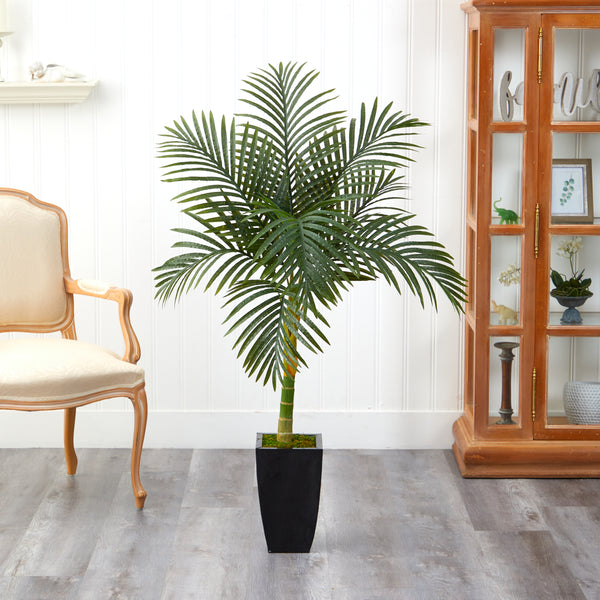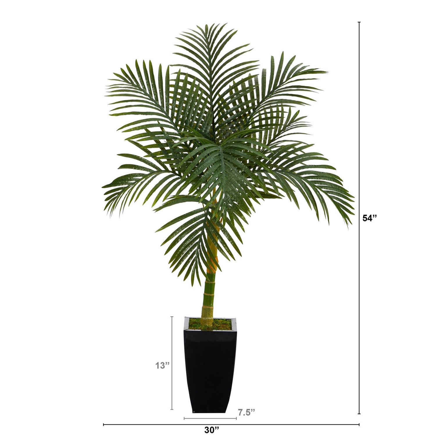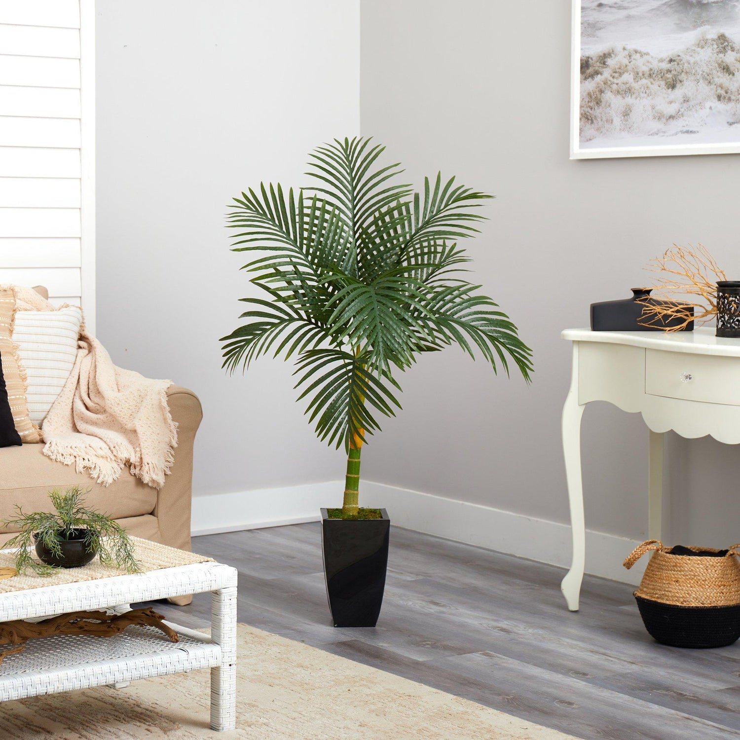 Summer is always here with this Golden Cane Artificial Palm Tree. Different shades of palm fronds contrast each other and create green foliage that adds visual interest and symmetry. The trunk has natural, intricate detailing like the multi-hued variegation that is found in the real ones. Standing 4.5' from a black metal planter, curate in tight spaces that need some summer love. Perfect for bathrooms, living rooms, apartments, and awkward corners. ?