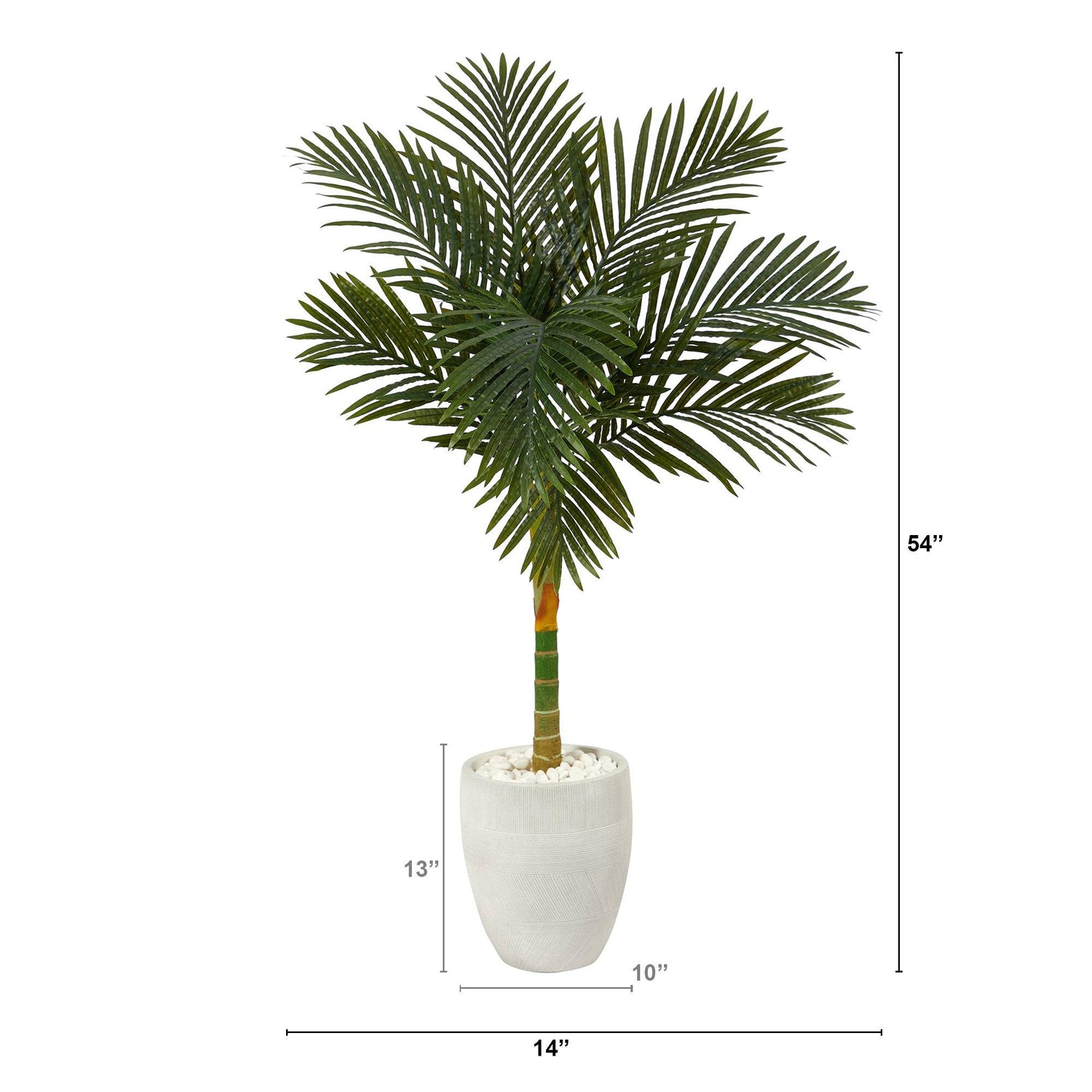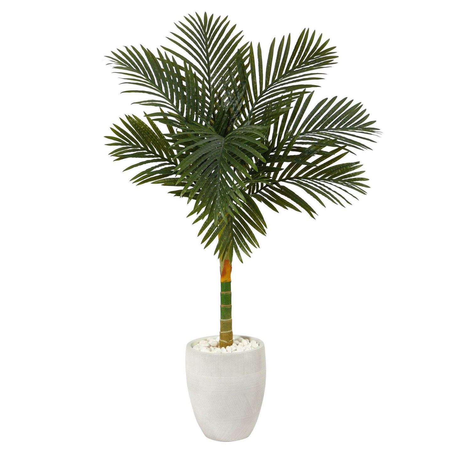 Fancy a fresh, beachy breeze in your home? Recreate a Caribbean beach all year long with this Golden Cane Artificial Palm Tree turning up the heat. Featuring lush iconic palm leaves that stem from a trunk with different textures and colors, display coastal charm. Standing at 4.5', from a white planter, bring some greenery to areas that need a breath of fresh air. Decorate in compact living spaces such as corners, apartments or bathrooms. Similar to a vacation, this Palm Tree requires zero effort on your part.