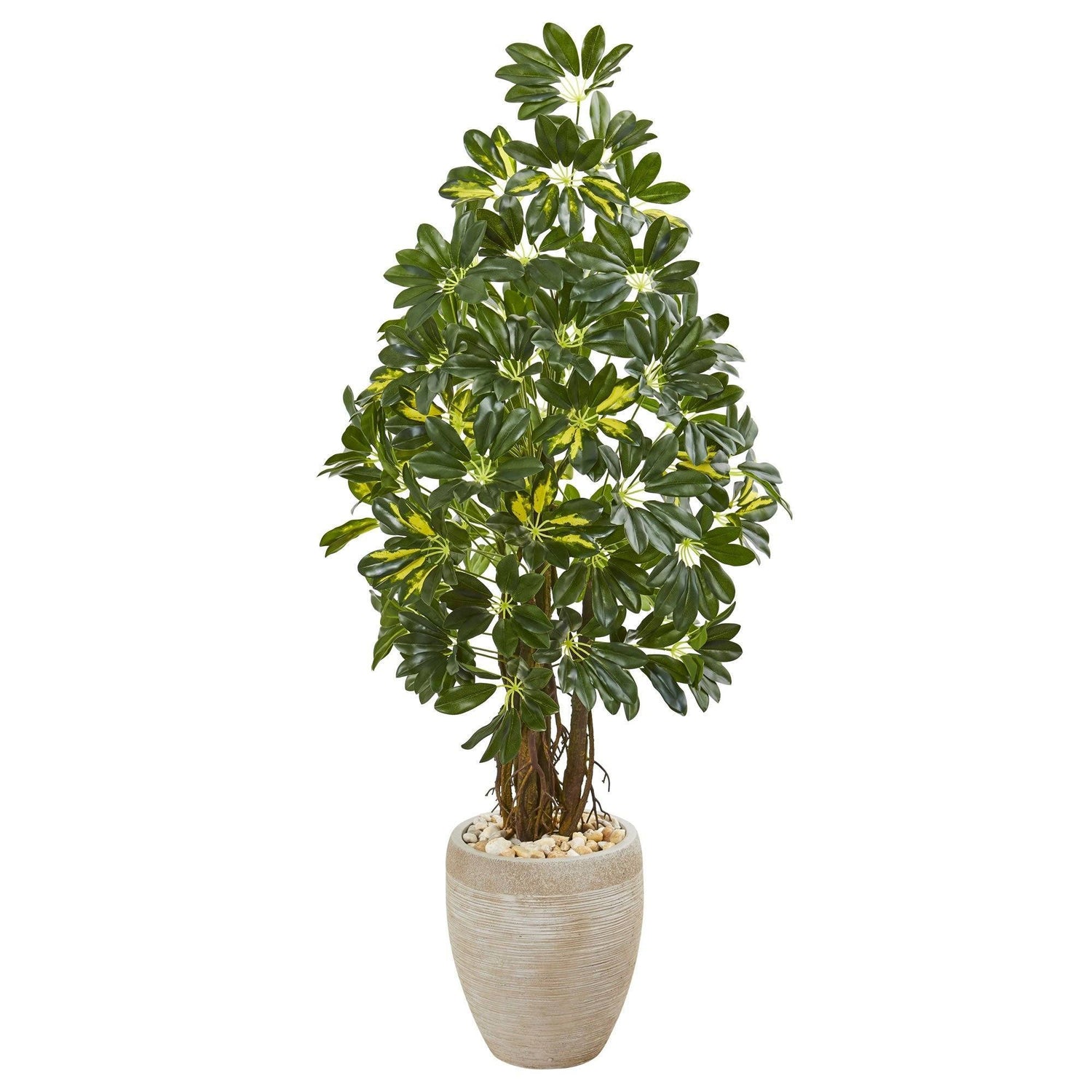 The artificial schefflera features a single head of lush, variegated green leaves with yellow tints that seem to grow straight out of the simple sand colored planter. topped with river rocks At 4.5-foot tall, this tree can fill in any tight or bare corners in your home or office. Or, you can bundle this piece together with other artificial flowering plants to instantly create a tropical beauty in your space.