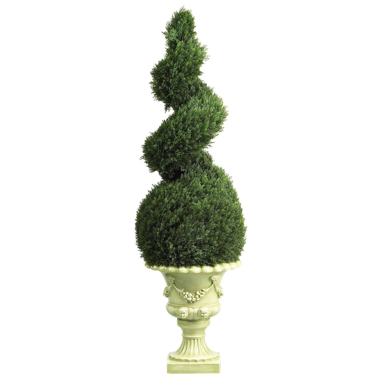 Now you can enjoy the fine art of topiary with no skills required. This bold but graceful Cedar spiral stands 4 feet tall. A pair of these attractive plants makes a nice addition to any home or office entryway. 1625 lush natural looking cedar leaves is the secret to this plant’s aesthetic appeal. A cream-colored European styled urn creates an elegant classy appearance that’s second to none. Perfect for both indoor and outdoor use.
