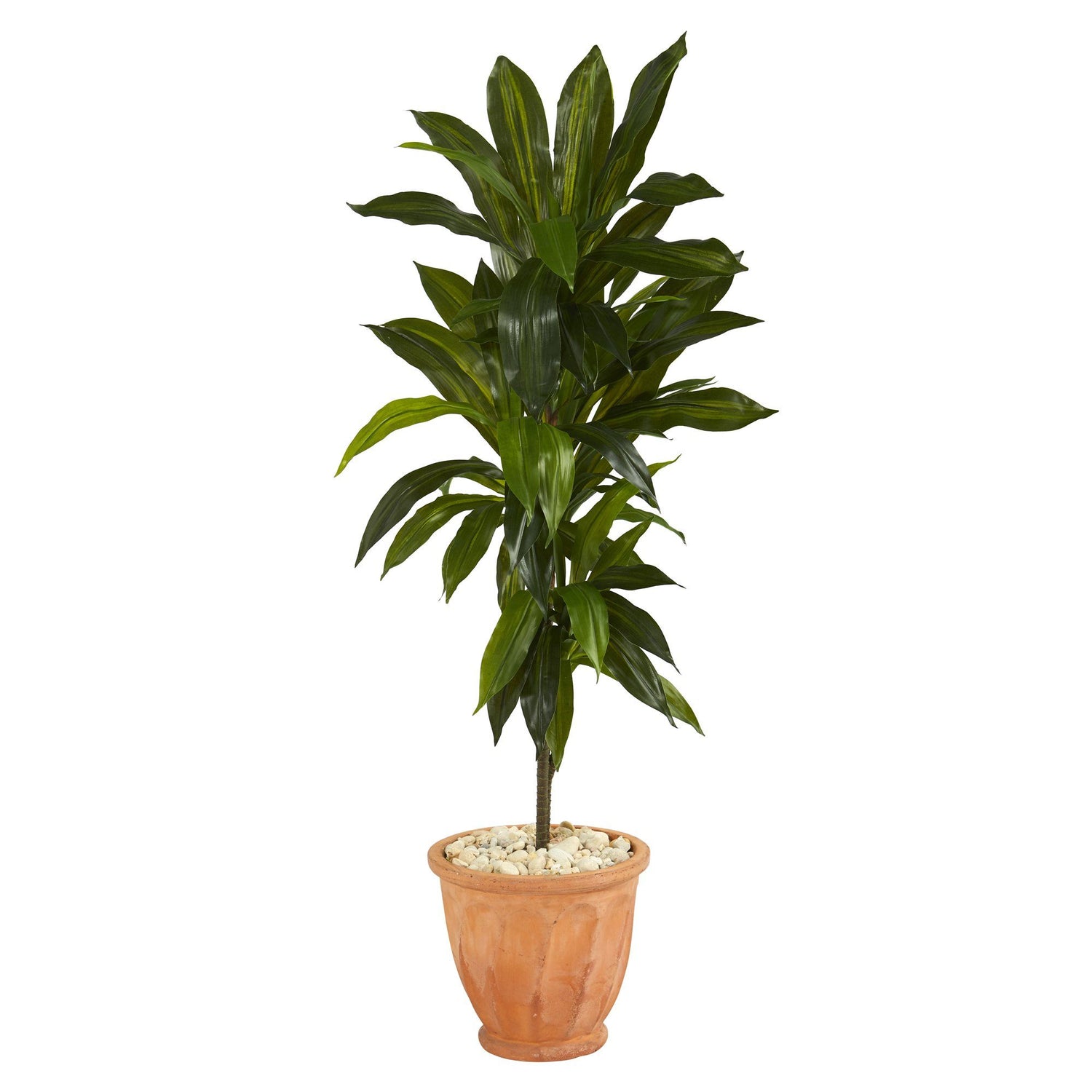 Create a lush, fresh environment throughout everyday interiors with the help of this artificial plant boasting several tiers of bright, dracaena foliage designed from the finest materials, stemming from realistic textured trunks - all of which feel real to the touch. Standing 4’ high from a terra-cotta planter, this tropical fake plant will effortlessly add vibrancy to a home or office space.