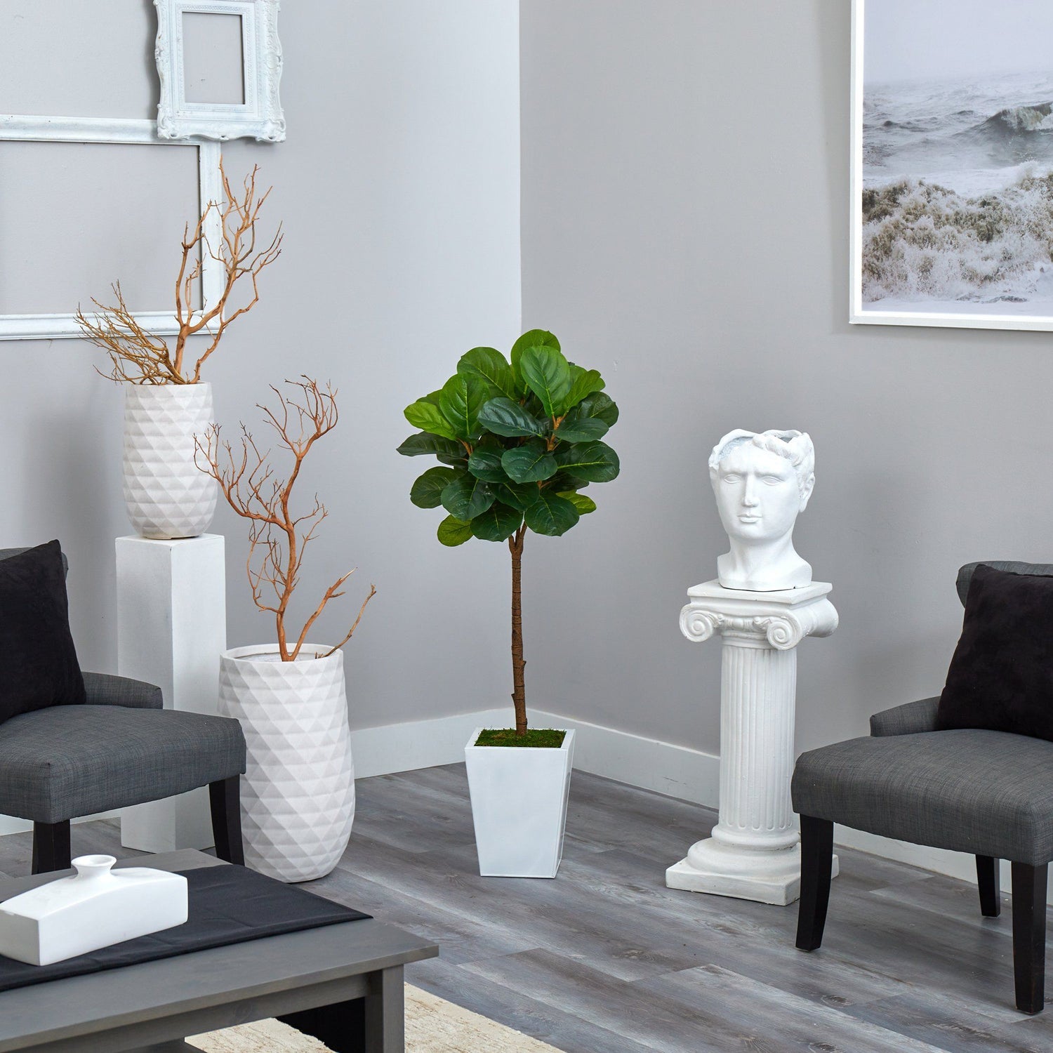 See what’s the buzz behind the Queen bee of the bunch with this artificial Fiddle Leaf Tree. Known as picky and incredibly difficult to grow indoors, this African plant can be yours maintenance free. Featuring large, glossy green leaves, stemming from a thin light-brown trunk, transform your scenery into an exotic African jungle. Standing 4” from a white metal planter, included in height, curate in compact spaces such as apartments, bathrooms, corners and kitchen nooks. Complements modern, mid-century modern, transitional and rustic home decors.