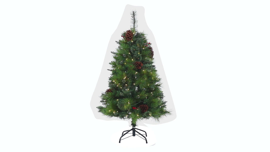 Spread seasonal cheer throughout even the smallest of spaces with the help of this artificial Christmas tree. Entirely maintenance-free, this traditional looking Christmas tree boasts a full, classic silhouette made up of 318 easy-to-bend branches for showcasing holiday ornaments, accented throughout with faux pinecones and holly berries that look incredibly lifelike. Arriving pre-strung with 150 clear LED lights to eliminate tangles and carefully stabilized on an accompanying base, this effortless 4’ tall artificial Christmas tree will complete your holiday decor - year after year.