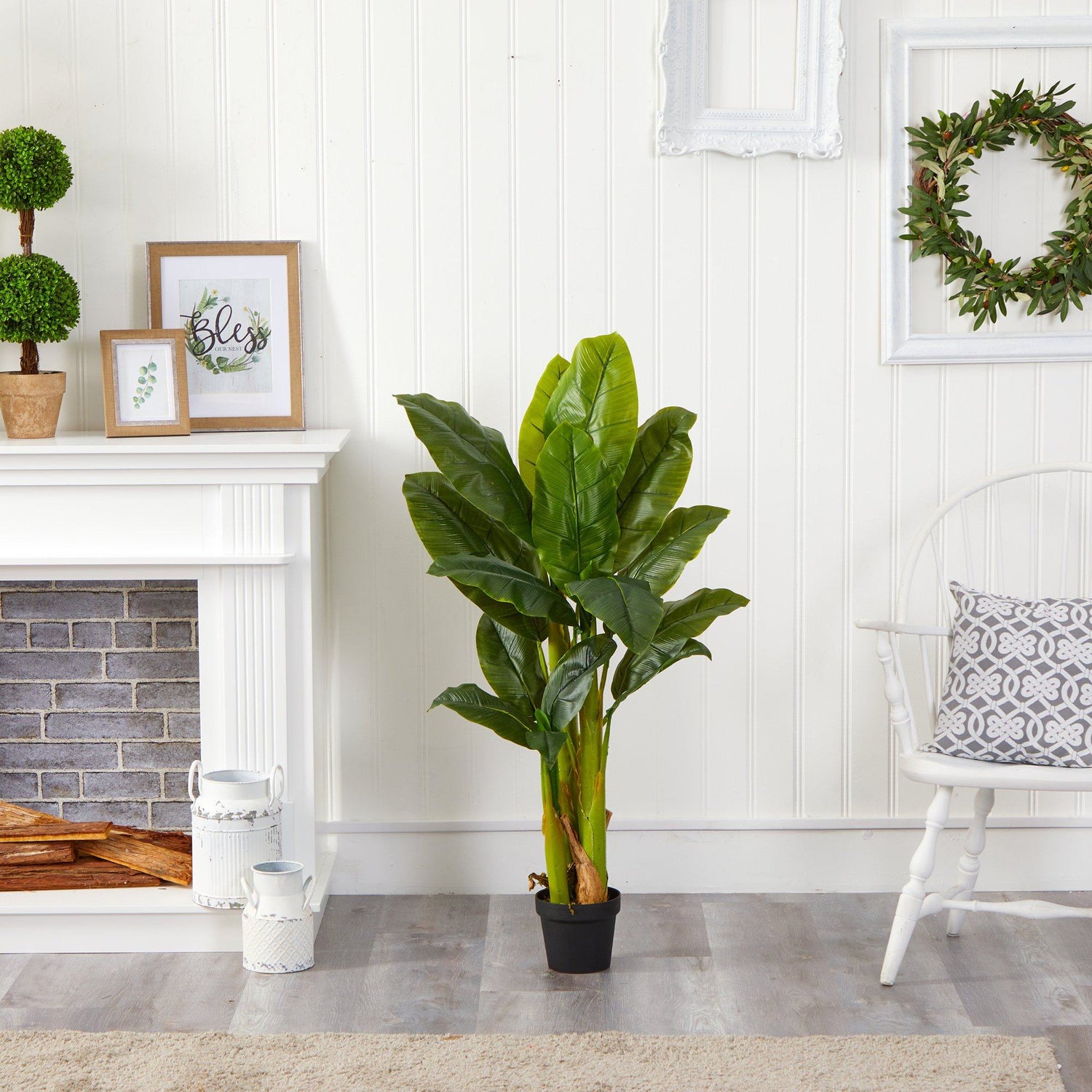 Create your own tropical paradise from your own home with the help of this artificial banana tree; boasting a canopy of oversized leaves atop various sturdy and stabilized trunks that look incredibly realistic to the naked eye and feels real to the touch. Handsomely designed in a palette of naturally occurring hues and standing 4’ high from an accompanying nursery planter, this fake indoor plant would evoke a sense of life wherever displayed.
