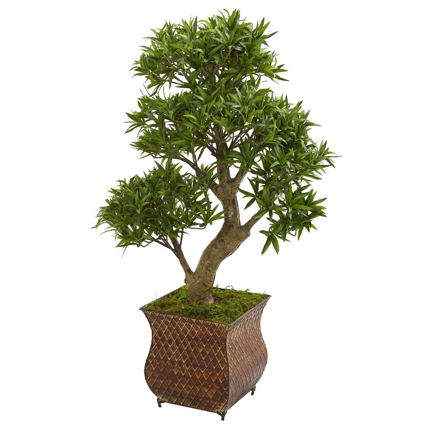 Add serenity to your space with this artificial podocarpus bonsai tree. Featuring a single trunk branching several manicured little bushes rich in foliage, it stands 40” high from a metal planter. Great for displaying in an office or reception space.