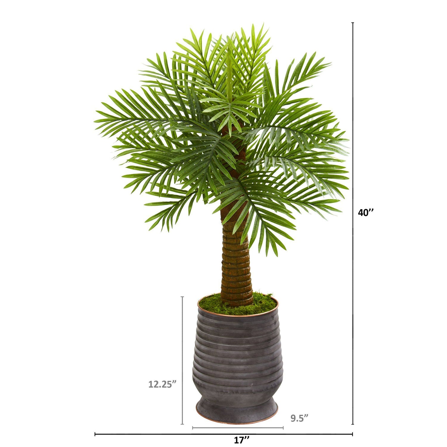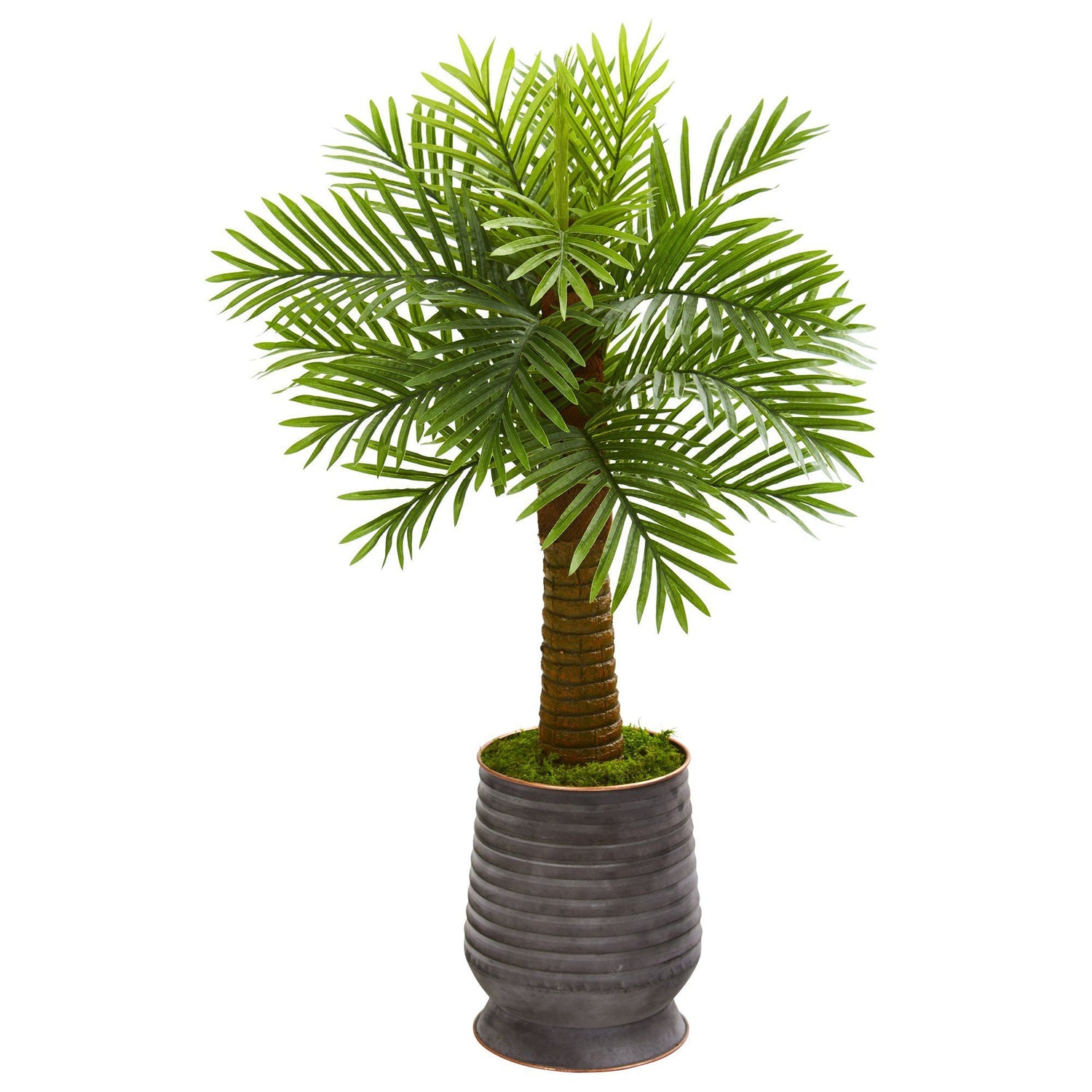 Create a soothing, tropical environment with the help of this artificial robellini palm tree designed with brightly colored, evergreen leaves sprouting from a sturdy, textured trunk. Standing 40” high from a ribbed metal planter nestled with natural moss, this silk tree instantly spruces any space it inhabits.