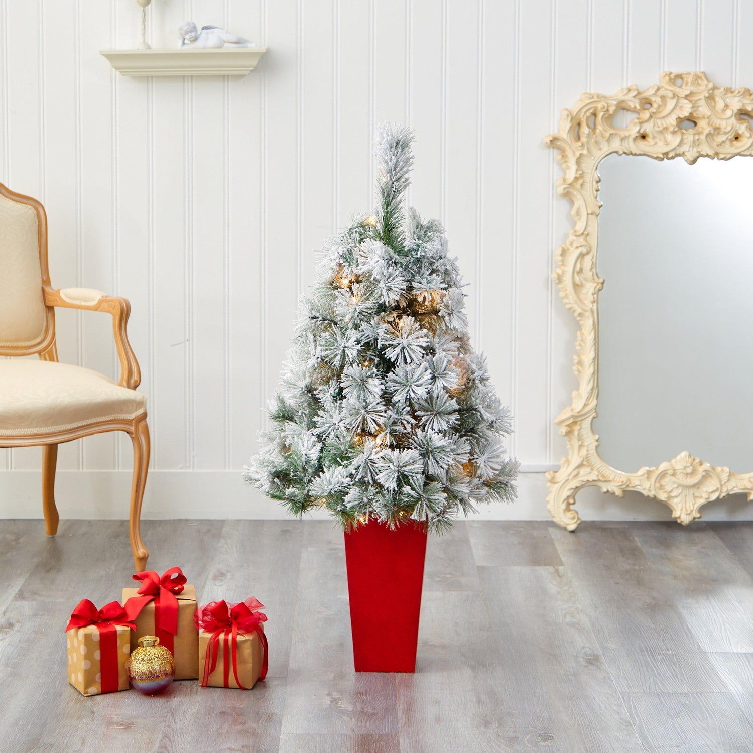 If you’re dreaming of a white Christmas, look no further, this flocked Oregon Pine Artificial Christmas Tree makes your wish come true. Designed to mimic real evergreen foliage and texture, this mini artificial Christmas tree features 113 easy-to-bend branches – allowing you to decorate with your mini ornaments. Pre-strung, with 50 clear lights, for a cozy feel - save time and money. Standing at 44" from a red tower planter (height includes planter), make a Xmas statement, wherever you curate. Its compact size makes it perfect for kids’ rooms, foyers, apartments, and dorms.