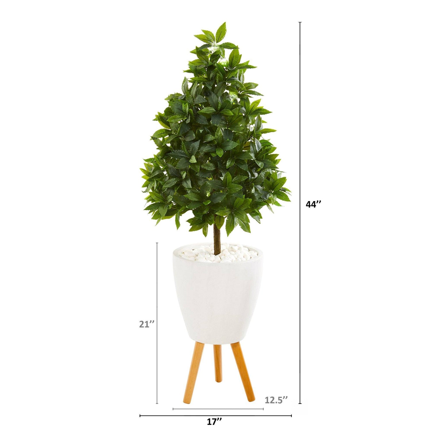 Highlight bare, tight spaces in a home or office with this artificial sweet bay tree boasting a thick collection of realistic foliage in a cone-shape topiary, stemming from a single sturdy trunk. Standing 44” high from a white planter with legs, this silk tree can breathe life into any space it inhabits.