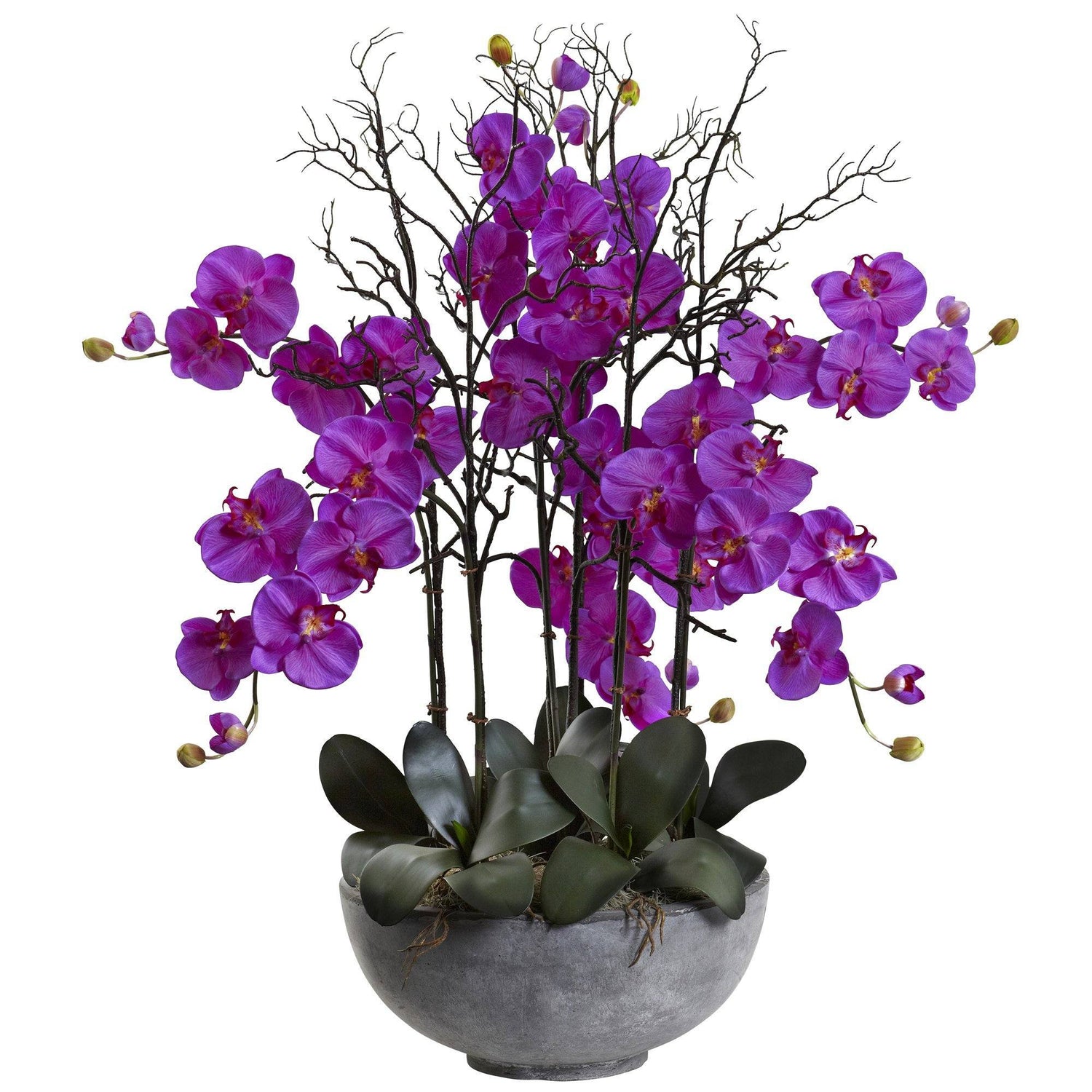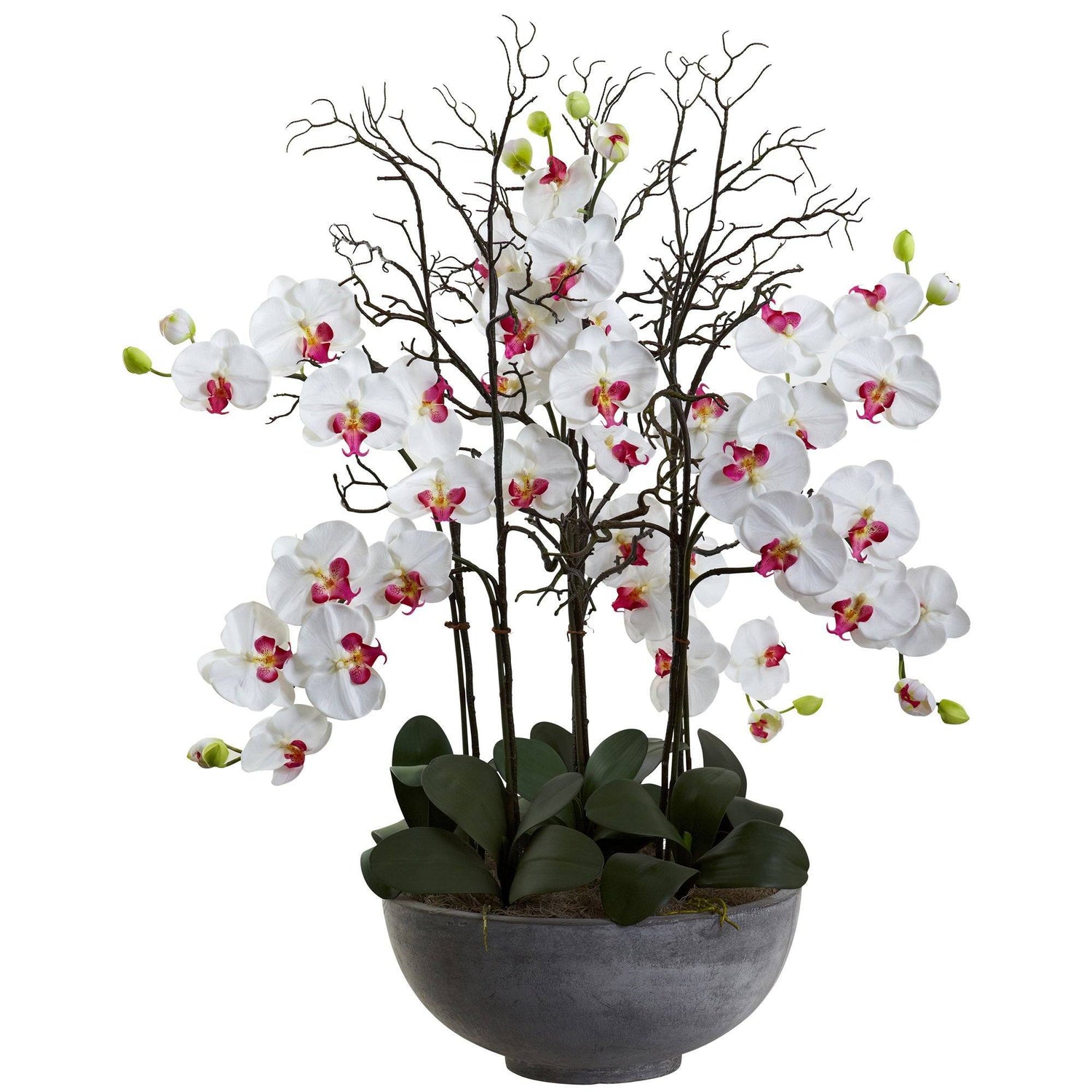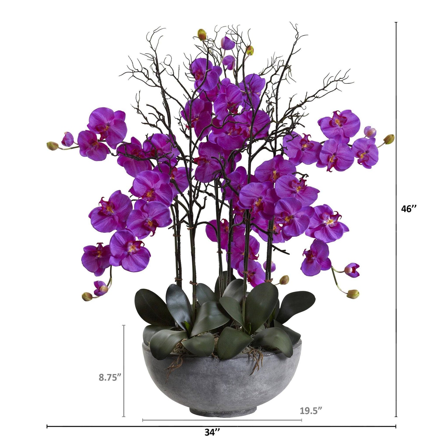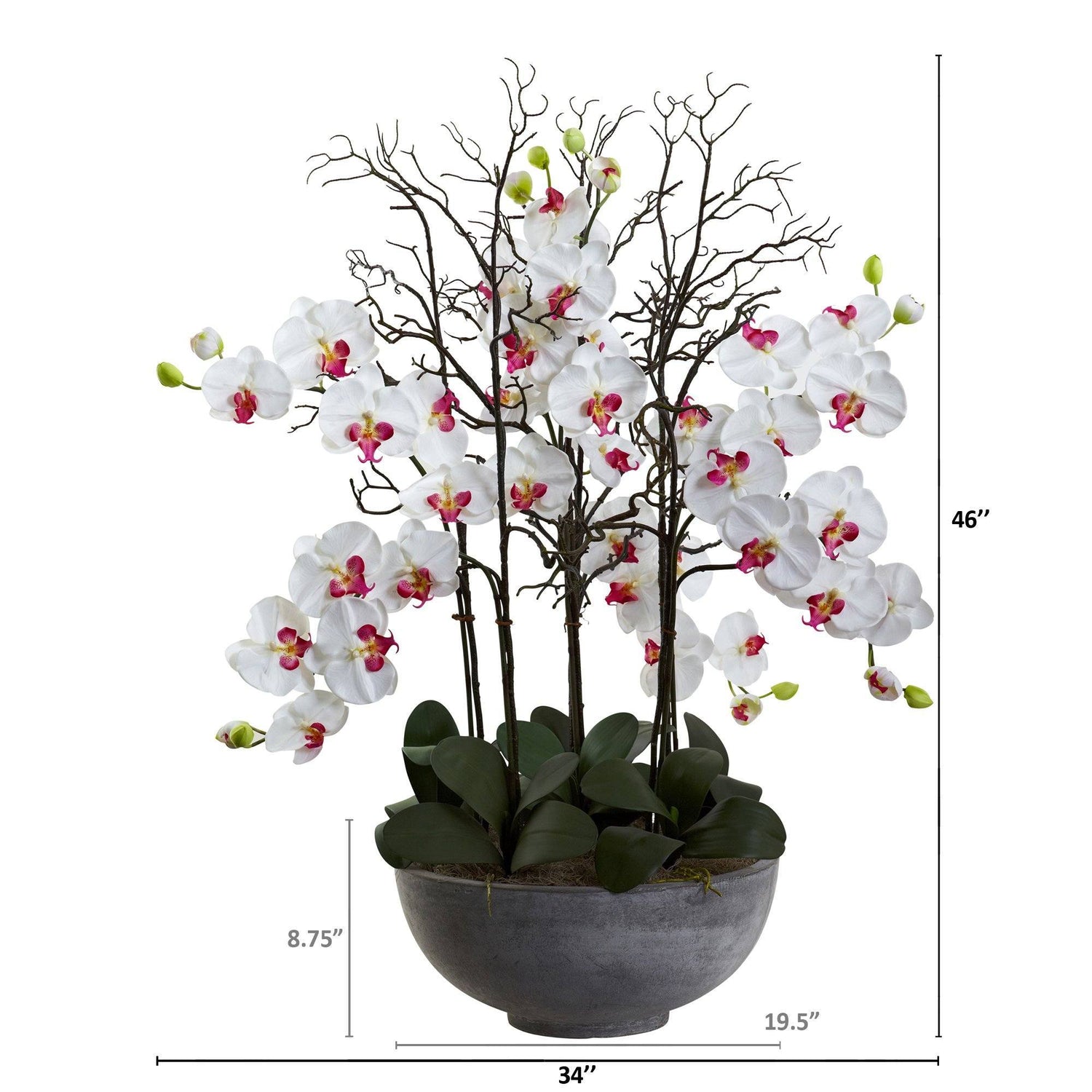 The curvature of this Phalaenopsis orchid’s petals shine in contrast to its straight stems. Dainty buds at the end of each branch and lush greens at the bottom complete the arrangement. A classic piece, this orchid would look perfect on a desk or tabletop. Handsome white planter included.