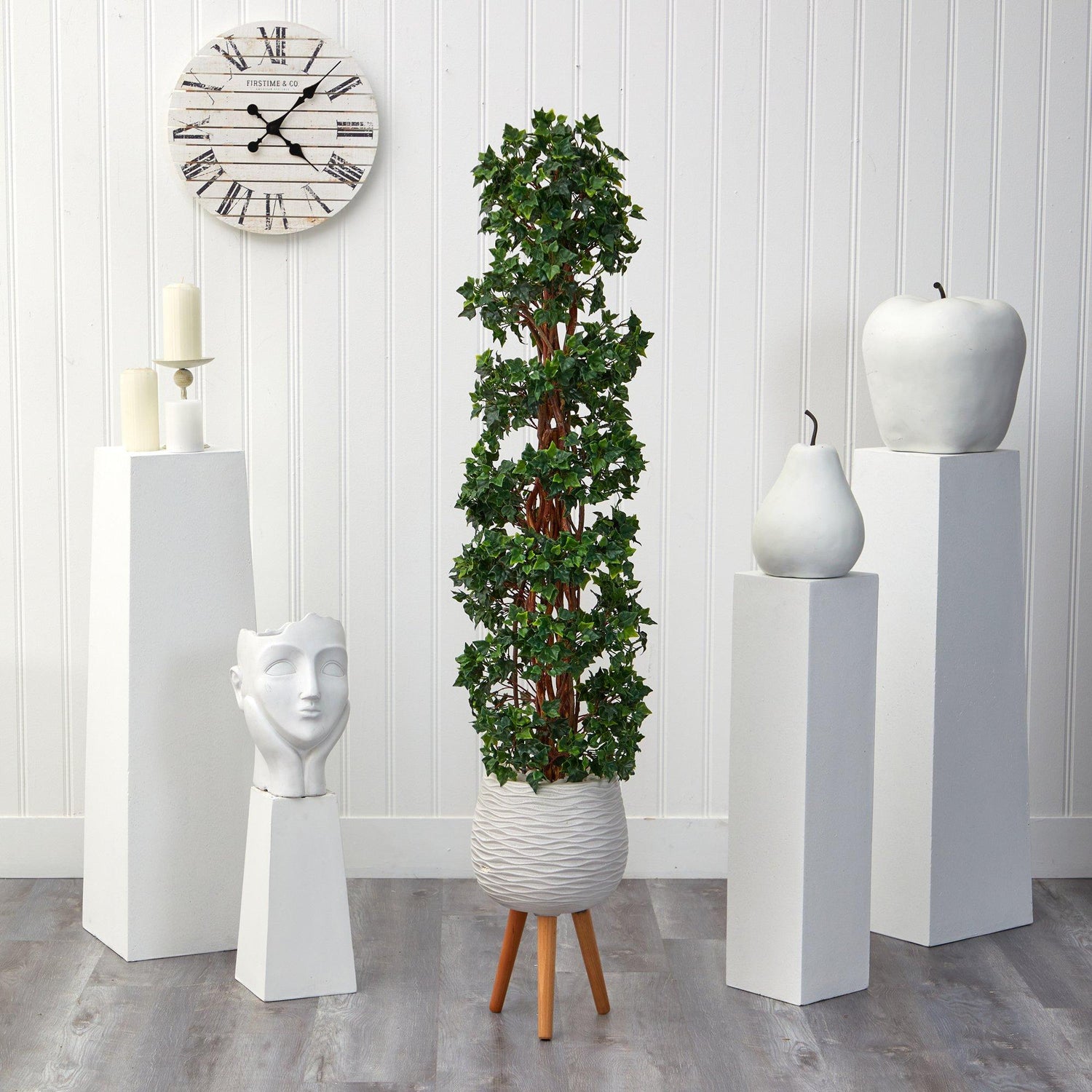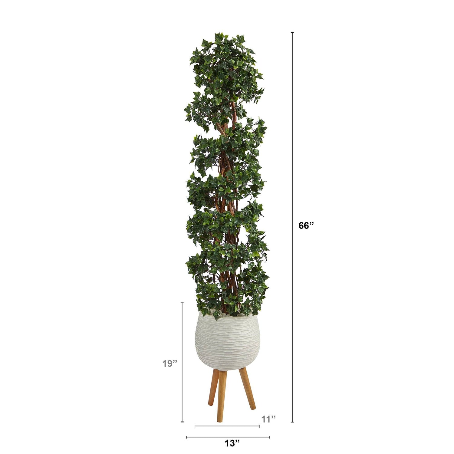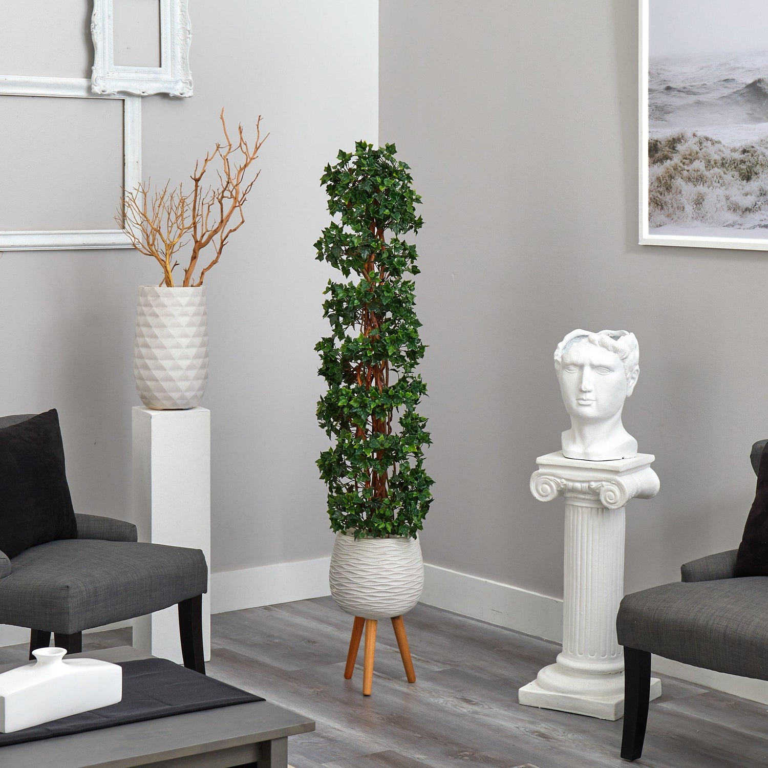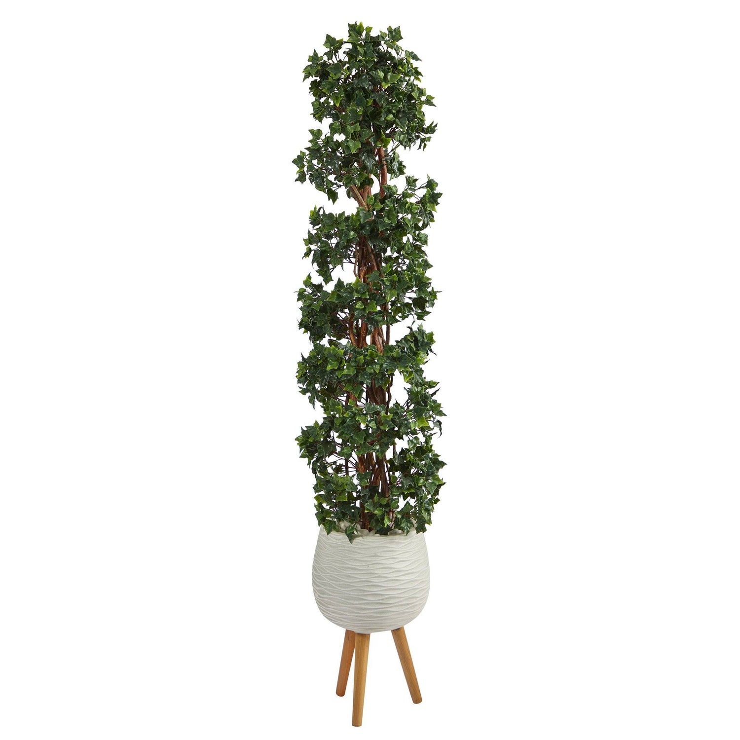 Learn how to always make a great first impression with this English Ivy Artificial Tree. Luscious green, heart-shaped leaves spiral around braided real, natural trunks, creating a marriage of traditional English charm and curb appeal. This topiary stands at 5.5’ high from a modern white tri-pod planter and is outdoor-safe, so don’t worry about external sun damage. Bring royalty to your space by placing them in front of the garage, main door, or the entryway. Designer tip: if selling your home, place two in your entryway to increase home value – first looks are everything to realtors and buyers.