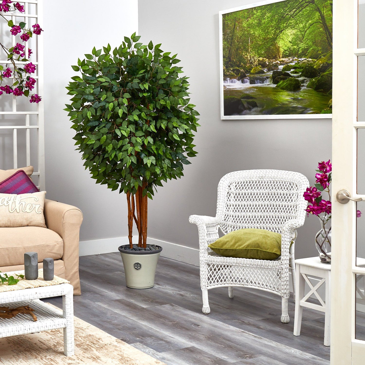 Ficus trees (weeping fig) are in right now. Known for their glossy leaves and braided trunks (if you’re lucky enough) – grace any room with their presence. This faux Ficus Tree with a natural trunk elegantly showcases green, variegated leaves from slender branches that arch from 3 braided real, natural trunks, adding a decorative, organic touch. Visually appealing, standing at 5.5’ from a decorative planter, curate this beauty in your living room, bedroom, or nursery for a soft, delicate look. This artificial ficus tree is sure to never go out of style.