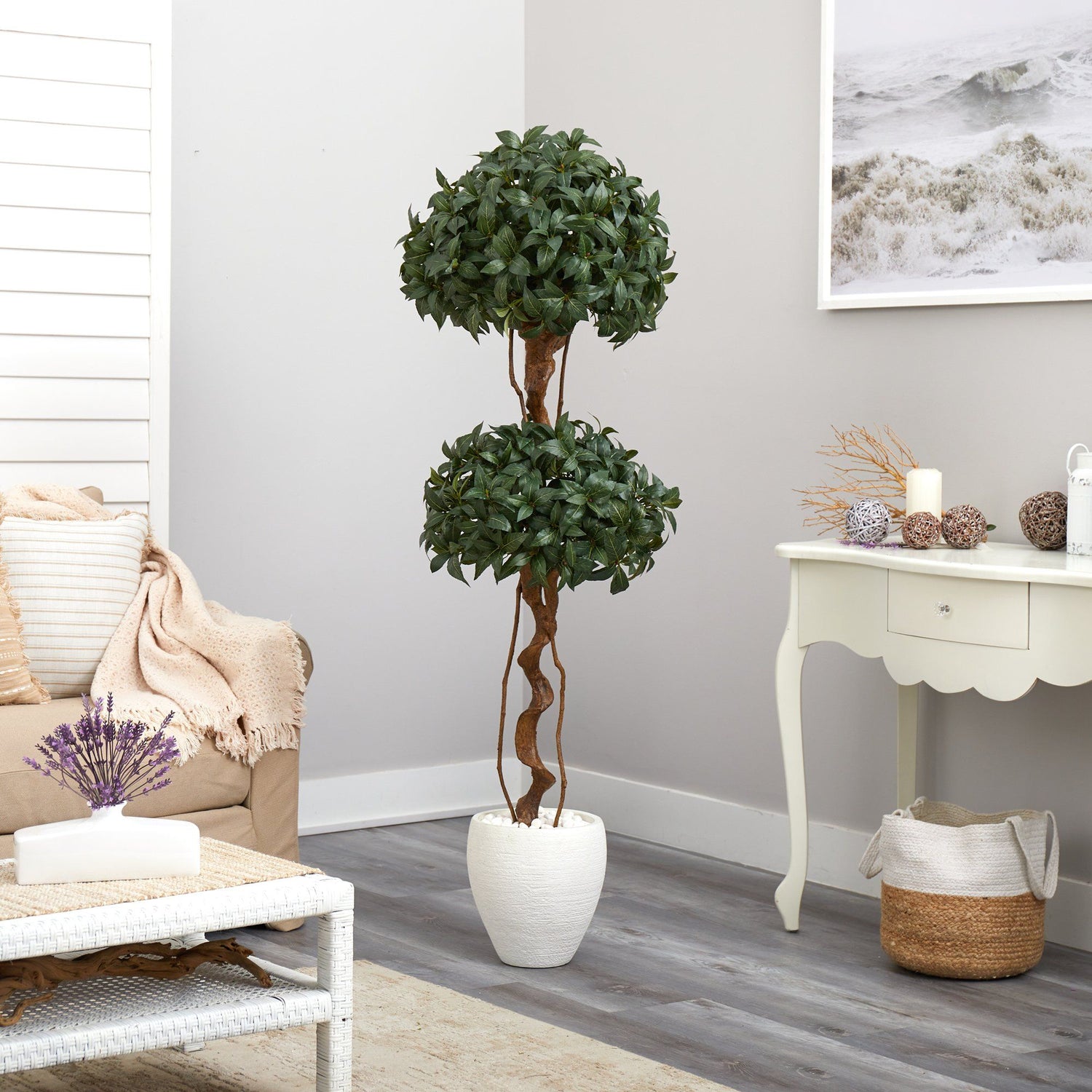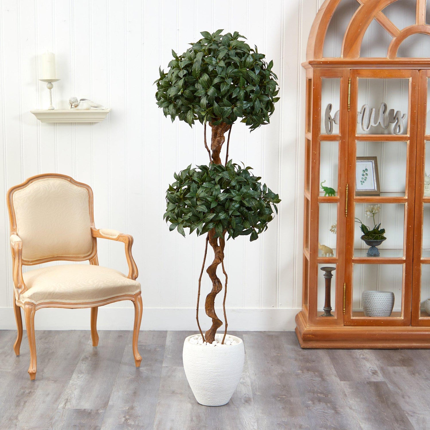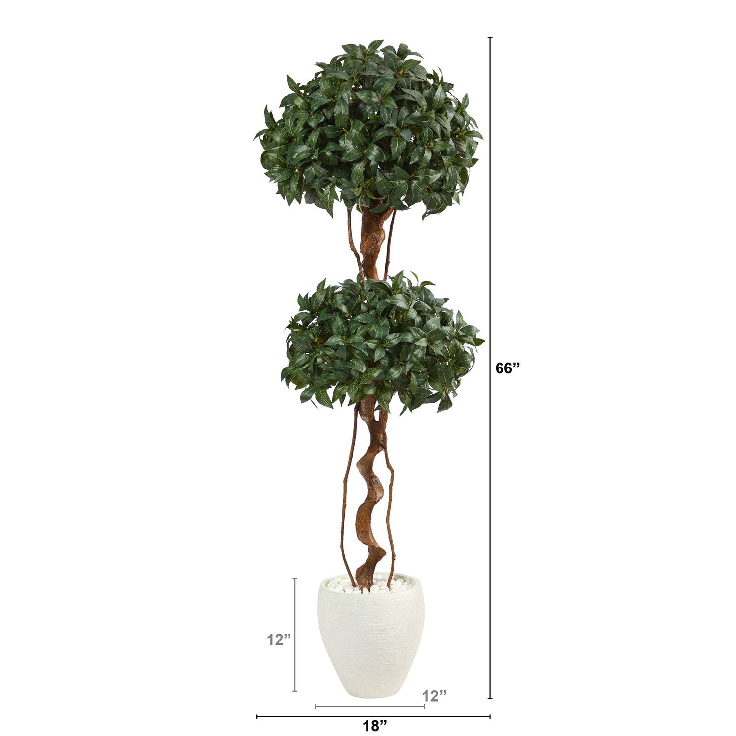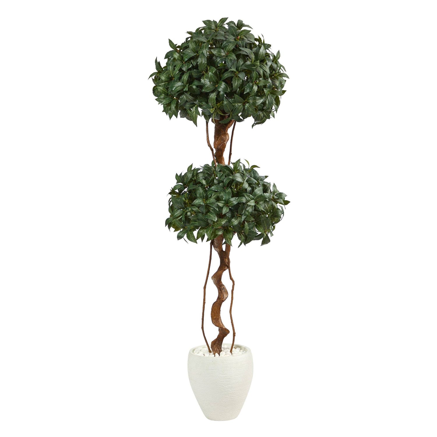 Two is better than one. This is true with the Sweet Bay Double Ball Topiary Artificial Tree displaying two ball-shaped topiaries. Native to the Mediterranean, 1480 sweet bay leaves, generally used as a seasoning, hang from whimsical twisting trunks with a rustic appeal to the eye. Standing at 5.5’ from a white planter (included in height) display this small faux topiary in compact spaces such as apartments, kitchen nooks, or offices. We recommend this piece as indoor use only.