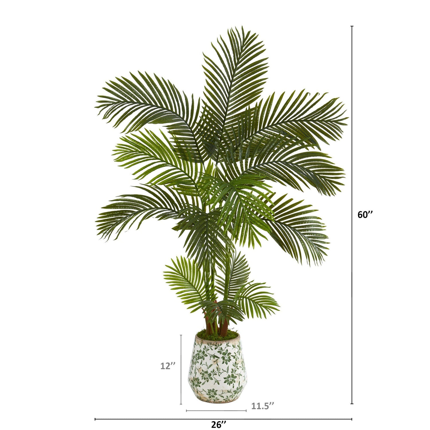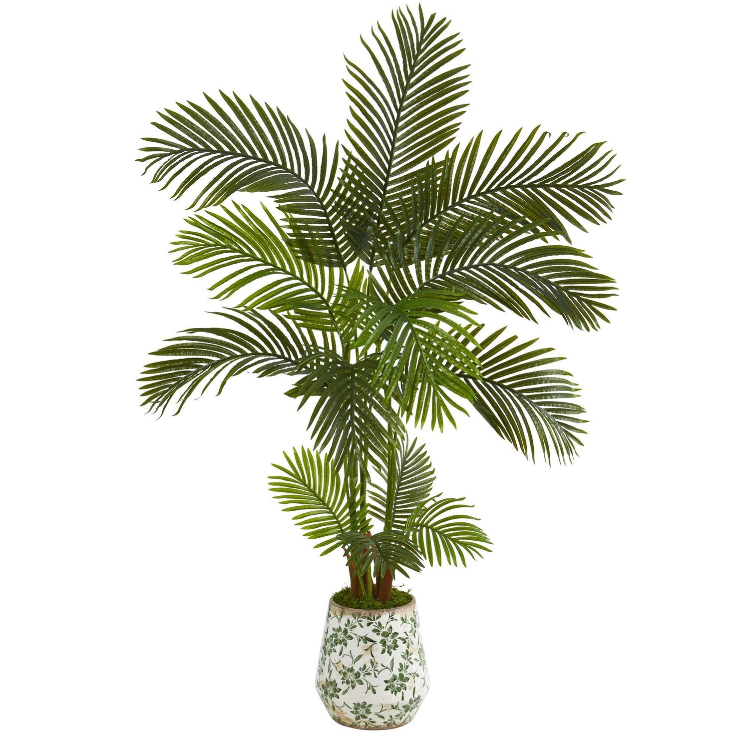 Add soothing greenery throughout everyday environments with this artificial tree boasting an overgrowth of realistically designed areca palm foliage showcasing naturally occurring details throughout its bright, vivid leaves. Standing tall and proud at 5’ from a floral print planter, this impressive fake tree will evoke instant freshness wherever displayed.