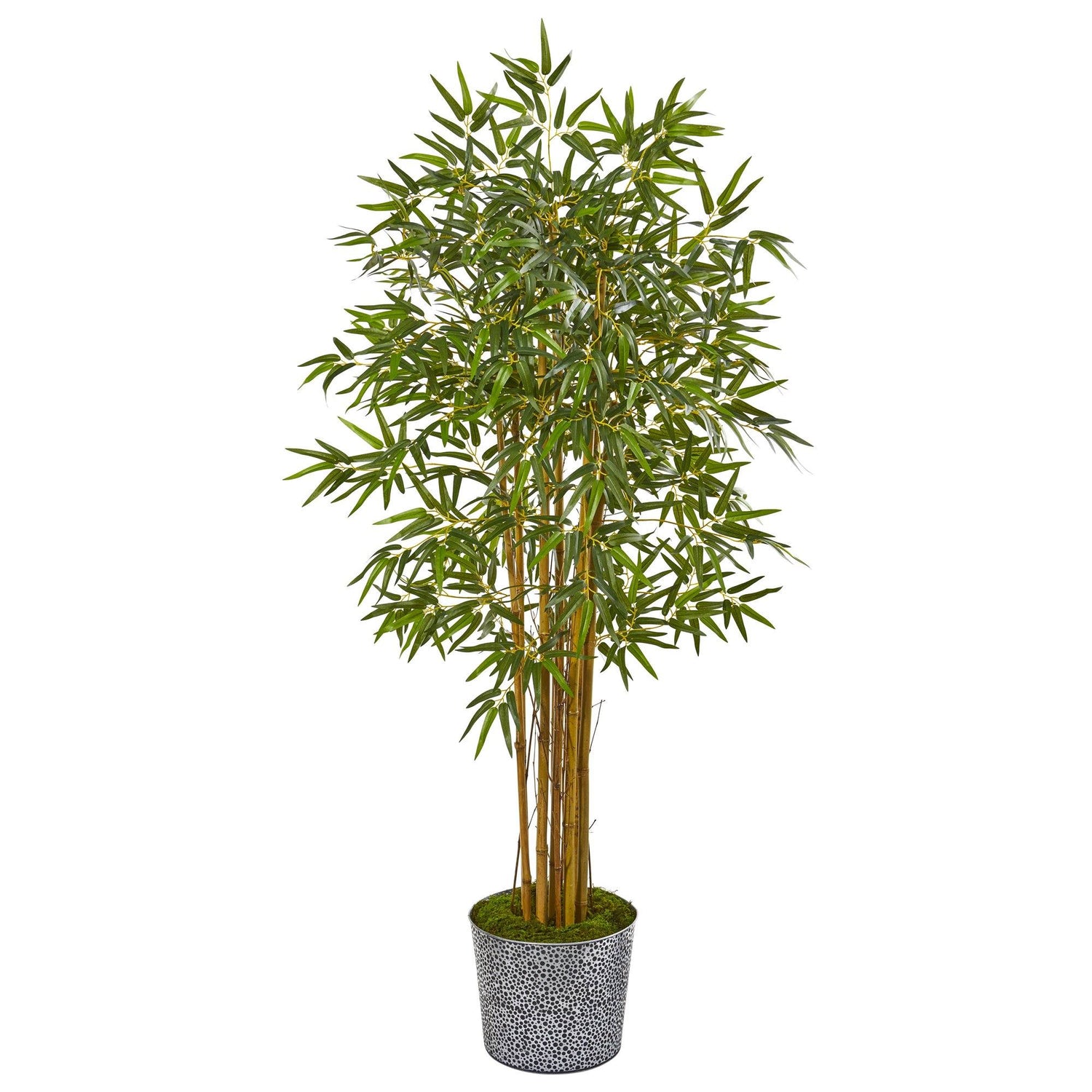 Accent your everyday environment with year-round greenery with the help of this artificial bamboo tree showcasing a rich collection of carefully designed foliage in bright, bold hues. Standing 5’ tall from a tin planter, this silk tree is perfect for tight spaces.