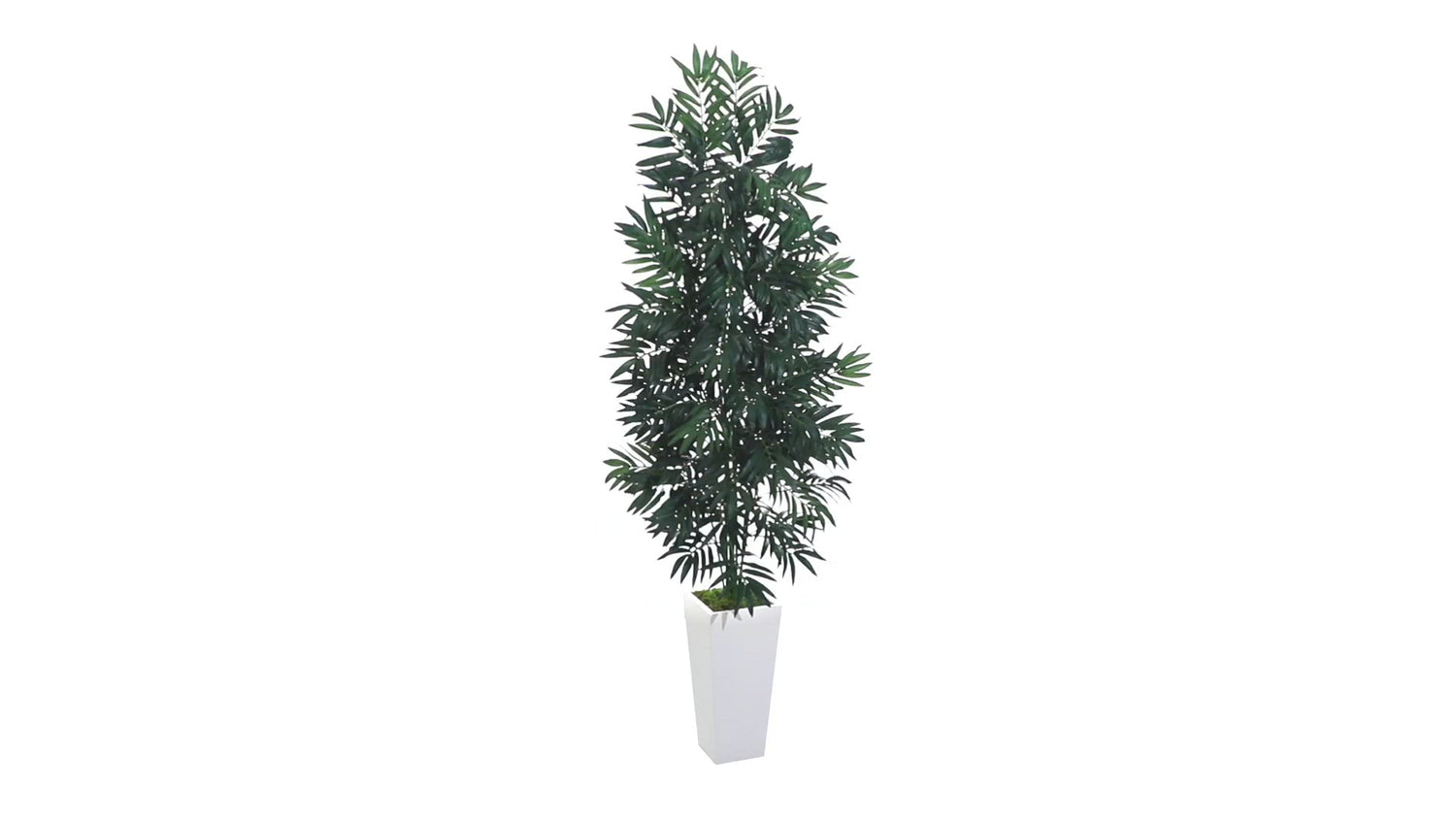 While the color white opens up a space, the color green relaxes it. This beautiful combination of color can be seen in this artificial bamboo palm plant. Contained within a white planter topped with natural green moss, the artificial bamboo palm stands at 5 feet tall. With vivid green leaves that extend outward, creating several layers, this is one ornament that will brilliantly accentuate the furniture in your sun room. To create a tropical feel, pair it with other artificial bamboo palms for a complete arrangement.