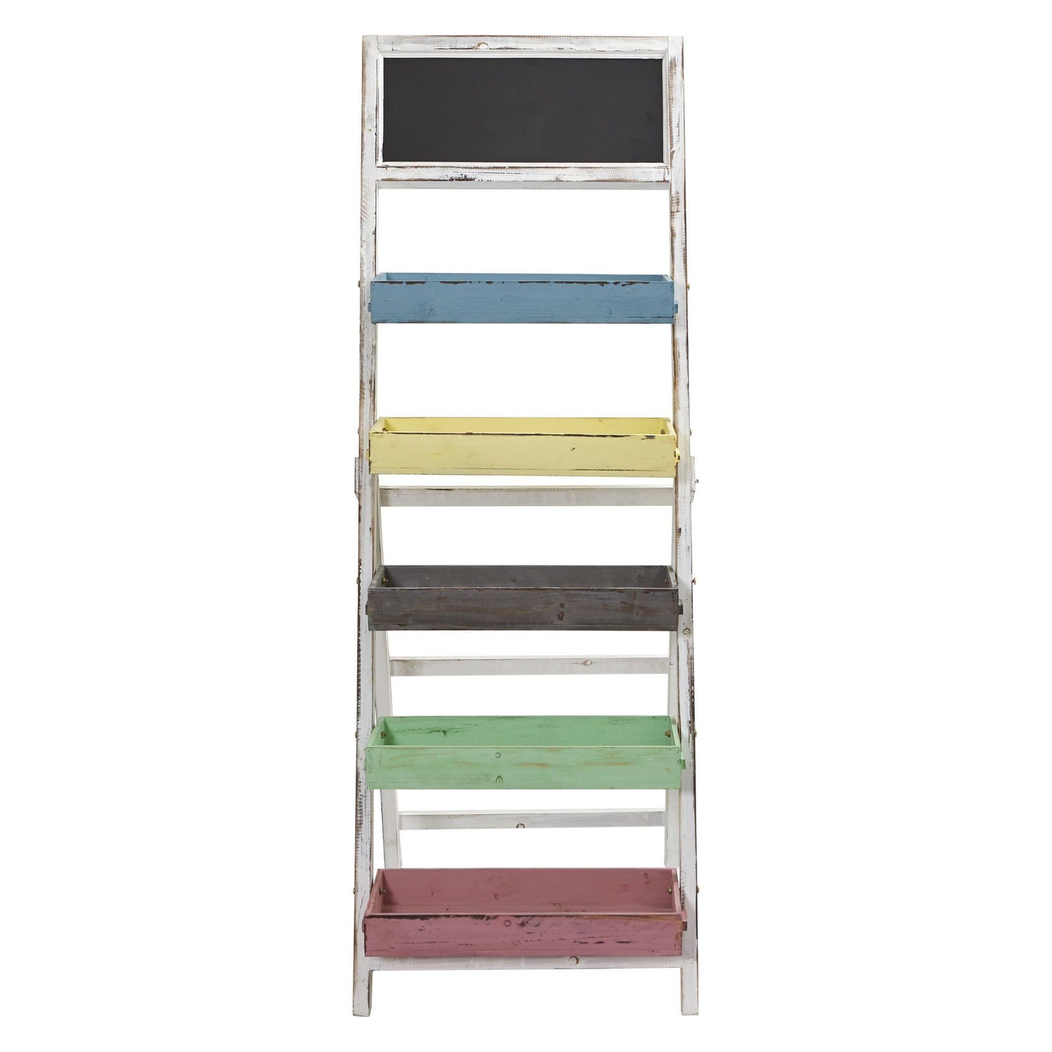 A multicolored chalkboard shelf that will suit in any country-inspired space. The five cascading wooden shelves can be used for a wide variety of storage needs. Since it's a freestanding shelf, it can also be placed anywhere in your home, even in tight places! Settle this in your kitchen to store your spices and other cooking essentials. Or, it'll be a great addition to an entryway and stack some books. The chalkboard on top can be used to leave notes and reminders for your family. Also could be used a multi level planter for added greenery.