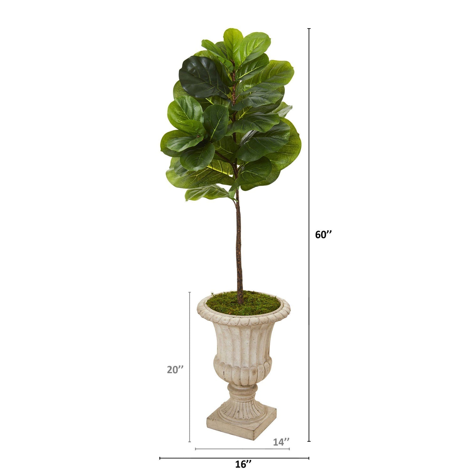 Freshen up even the tightest spaces in your home or office with the help of this artificial fiddle leaf tree boasting a canopy of thick, glossy leaves in bright, vivid hues, sprouting atop a skinny, texturized trunk - all of which feel real to the touch. Standing 5’ high from a sand finished urn stabilized with natural moss, this fake tree can instantly enhance any space it inhabits.