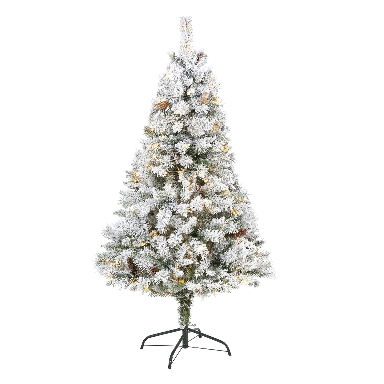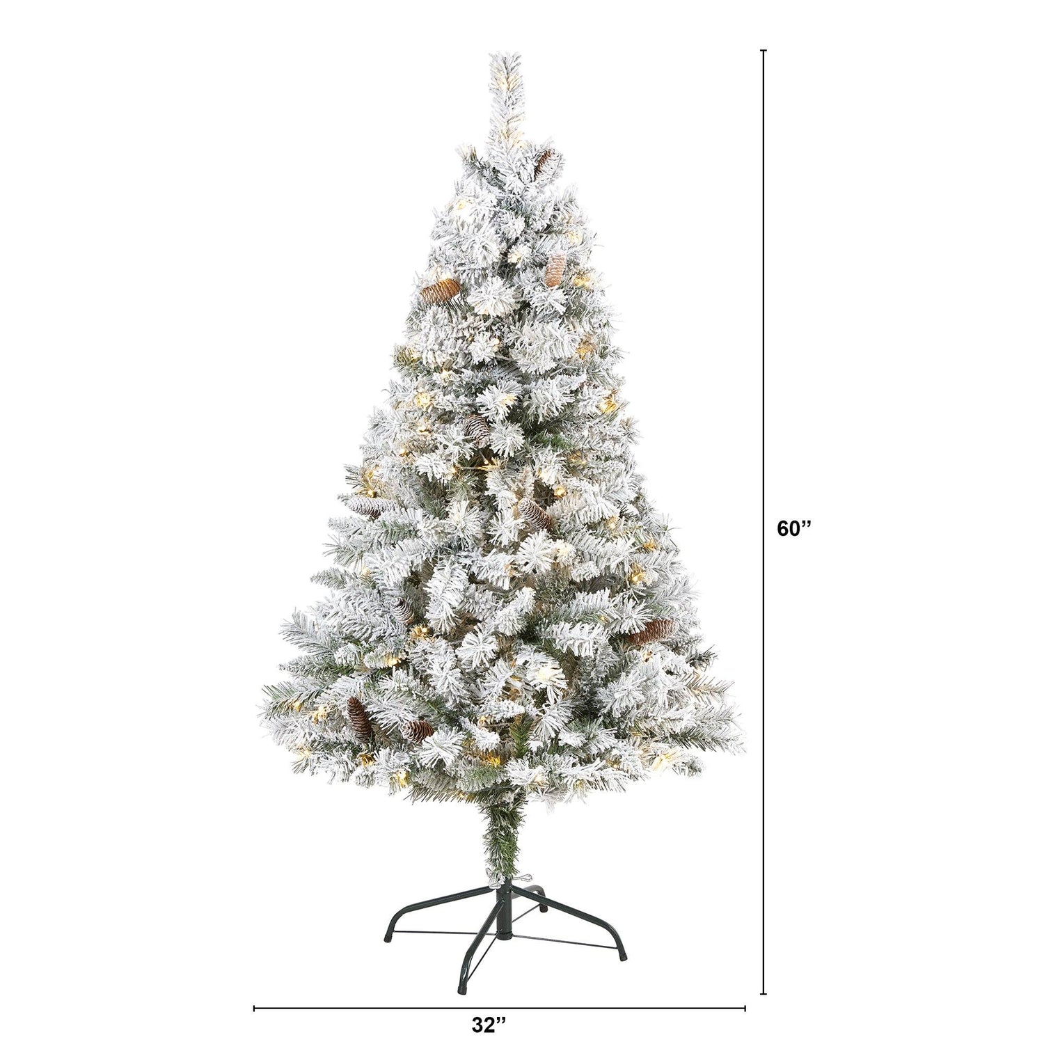 Create a picturesque Christmas this holiday season with the help of this Flocked White River Mountain Pine Artificial Christmas Tree. Easy to set-up and entirely maintenance-free, this winter-inspired Christmas tree boasts a robust collection of realistic looking foliage consisting of 360 easy-to-bend branches for showcasing holiday accents and accented throughout with faux pinecones that look incredibly realistic; it comes finished with a light frosting of faux snow to evoke the ultimate winter wonderland. Arriving pre-strung with 150 clear LED lights for stress-free decorating and carefully stabilized on an accompanying stand, this versatile 5’ tall frosted artificial Christmas tree will undoubtedly transform any home or office into a joyous holiday setting for years to come.