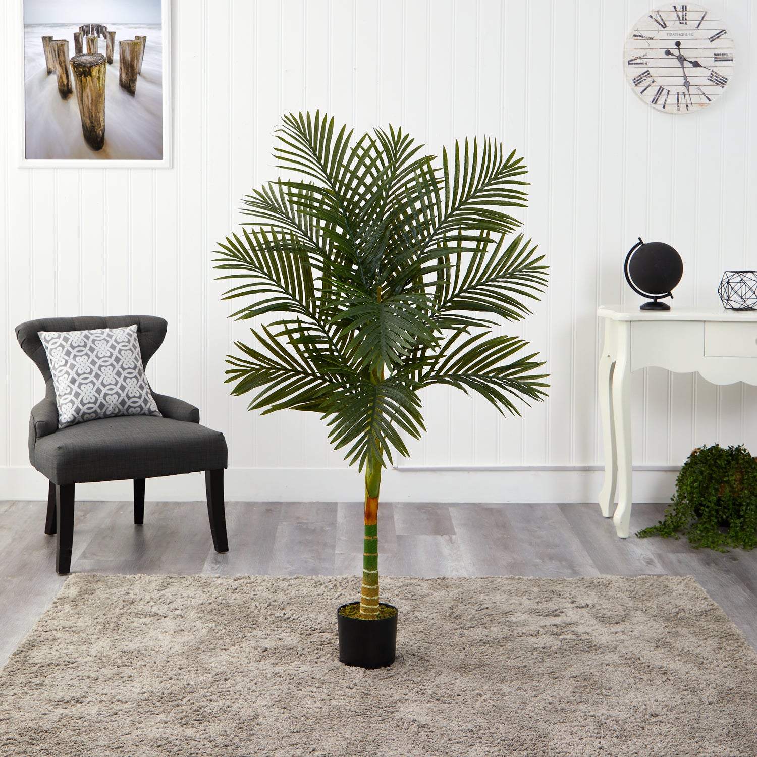 Picture your perfect summer vacation: Where you sun-soak on a hammock, feel the sea breeze hitting your face while sipping on a coconut. Luckily you can now tropic like its hot with this Golden Cane Artificial Palm Tree. It features lush, green leaves and gorgeous golden palm fronds stemming from a bamboo-like trunk with yellow hues. Standing a tall 5’ from a black planter, recreate island life in your sunroom, office (we promise smiling co-workers), or guest room. Do you want to feel the sea breeze with this tree?
