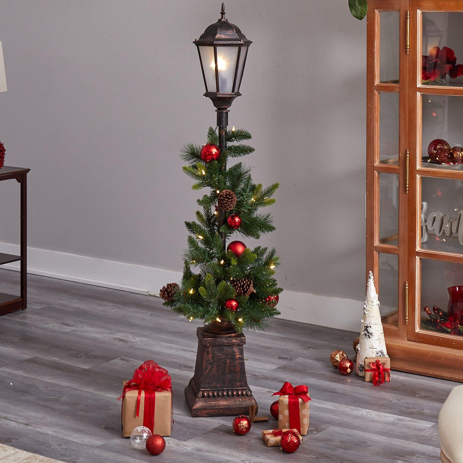 Dreaming of a fairy tale inspired Christmas? Make your holiday season a bit brighter by adding a lamp post that'll transport you to any holiday movie. Constructed from iron and in a sleek black finish, illuminate any area with the 50 LED lights. For a festive touch, a handcrafted evergreen Christmas artificial garland with 180 tips, pinecones and holiday ornaments adorn the thin silhouette and allow you to add your own ornaments. With a height of 5' add to any bare corner of your space in need of some Christmas cheer.
