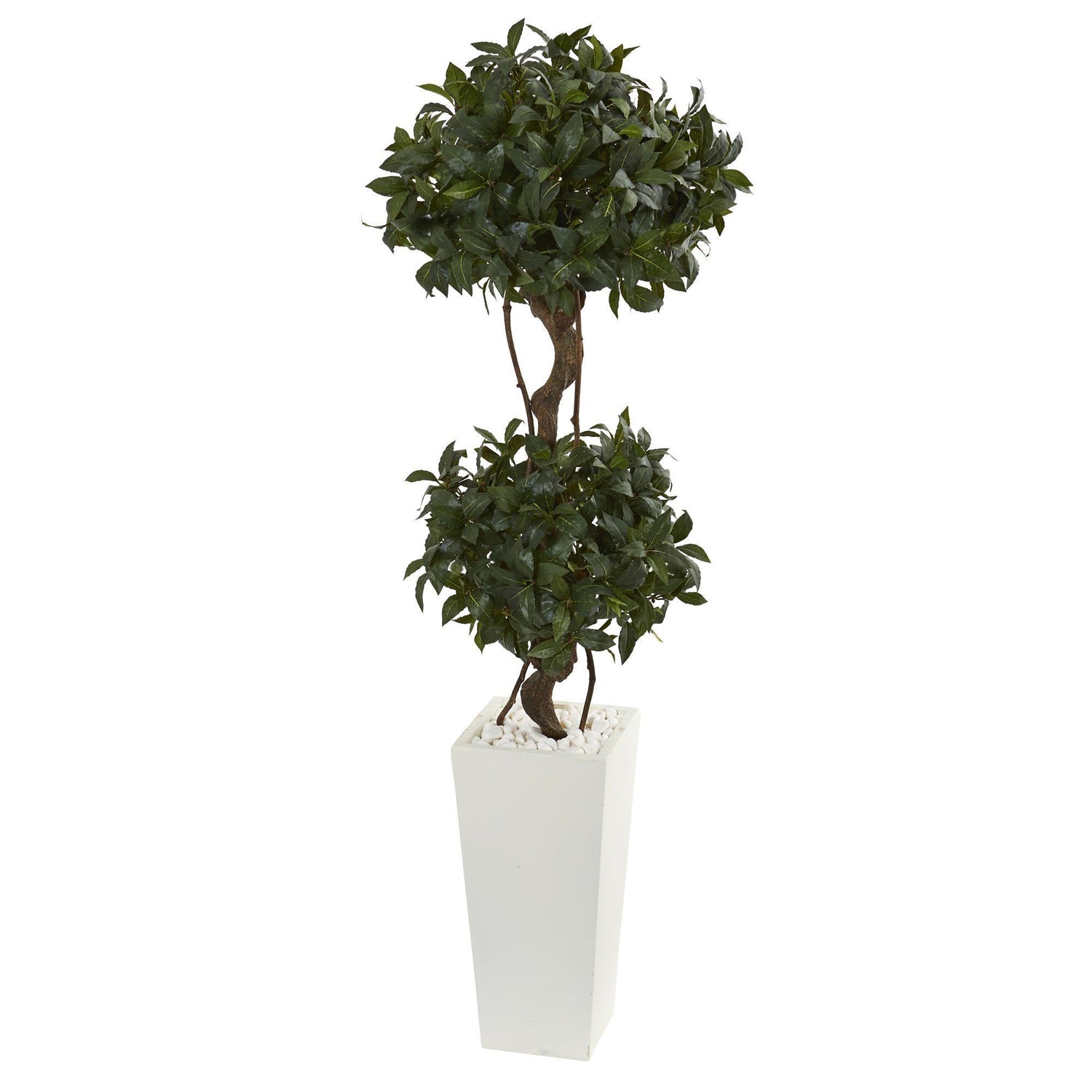 This artificial 5’ sweet bay double topiary looks is truly a piece to behold. Enjoy the elegance of a topiary indoors without the high maintenance. Comes in a elegant tower planter with real river rock.