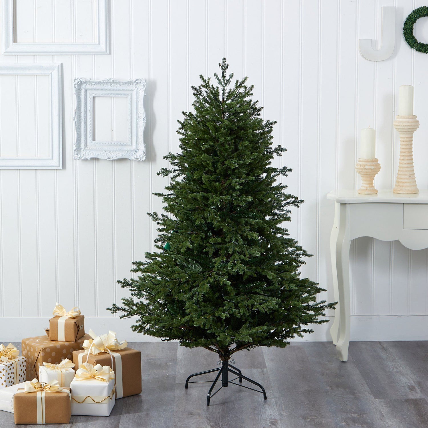 Create a traditional Christmas scene without the need for upkeep with the help of this easy and effortless artificial Christmas tree! Completely maintenance-free, this realistic looking fake Christmas tree boasts a robust silhouette of seasonal evergreens made up of 773 easy-to-bend branch tips for showcasing all your favorite holiday ornaments. Arriving pre-strung with 300 clear LED lights to eliminate tangles and carefully stabilized on a metal stand, this handsome 5’ tall artificial Christmas tree will not only make decorating a breeze but ensure your home is always holiday-dressed for years to come.