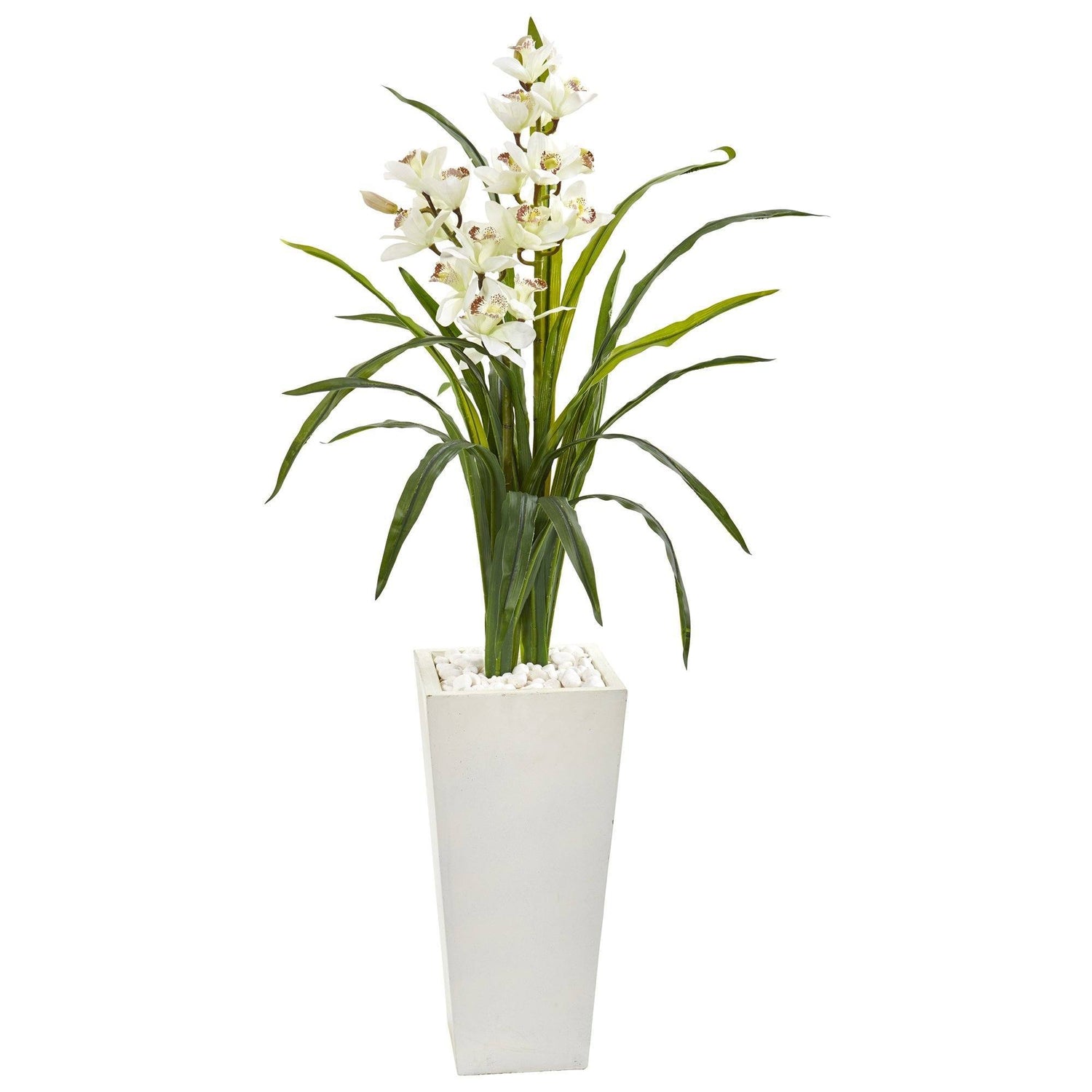 Natural beauty springs forth form of this artificial cymbidium orchid plant. Featuring delicate little blooms with lifelike petals and realistic looking leaves, this whimsy arranged plant alludes pure elegance. Standing 50”’ high, it’s displayed in a modern white tower planter finished with white rocks.