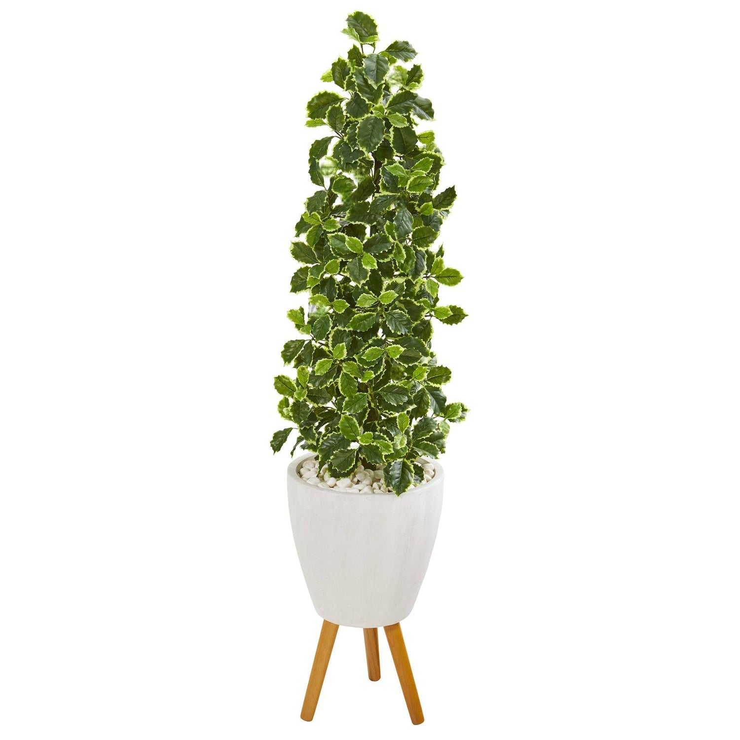 Freshen up tight-fitting spaces with this artificial holly leaf tree. Rich with variegated leaves with naturally occurring details, this lush plant is so lifelike it feels real to the touch. Reaching 51” high from a white standing planter nestled with natural tone rocks, this silk tree can instantly spruce up any space it inhabits.