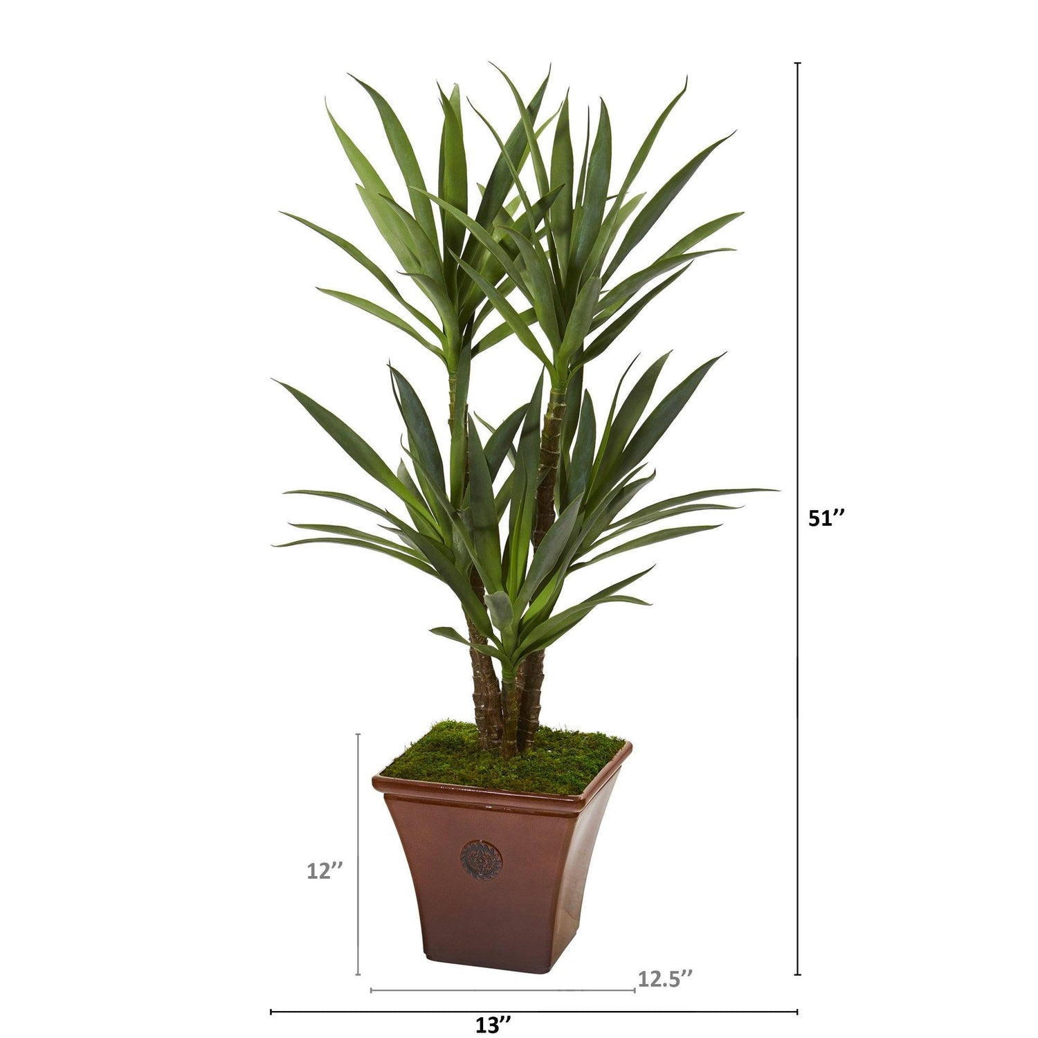 Freshen up every day spaces with this artificial plant containing sturdy, textured stems, each boasting sharp shoots of yucca greenery that naturally fan upwards from its brandy colored planter stabilized with natural moss. Standing 51” high, this fake plant makes for great year-round display.
