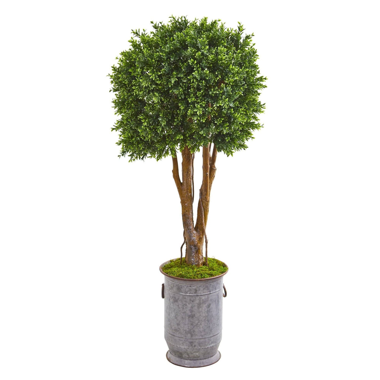 Add elements of farmhouse beauty with this artificial boxwood topiary tree boasting a dense canopy of realistic looking leaves stemming from a textured trunk. Standing 55” high from a planter nestled with natural moss, this little outdoor-safe tree would beautifully freshen up bare counters both inside and outside the home.