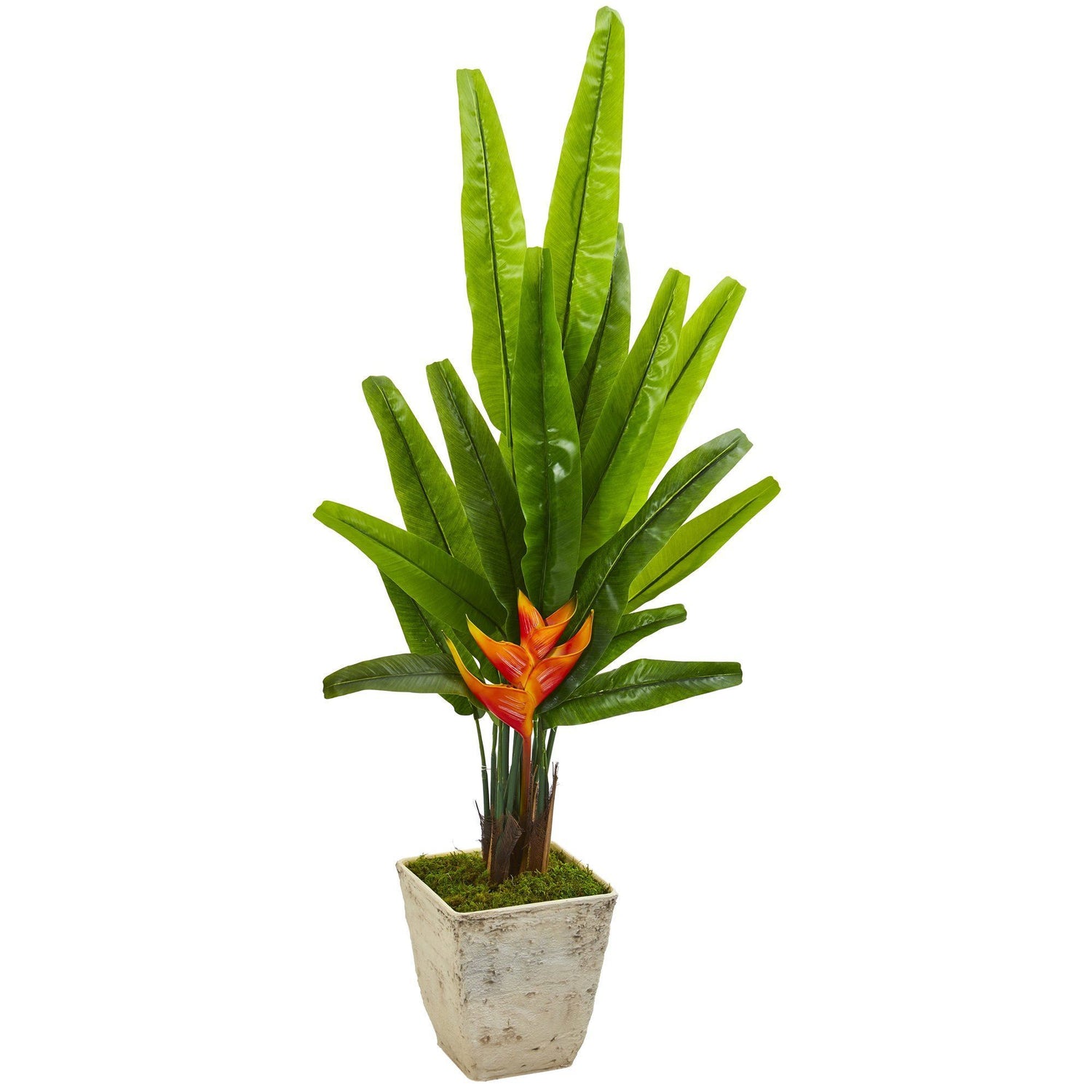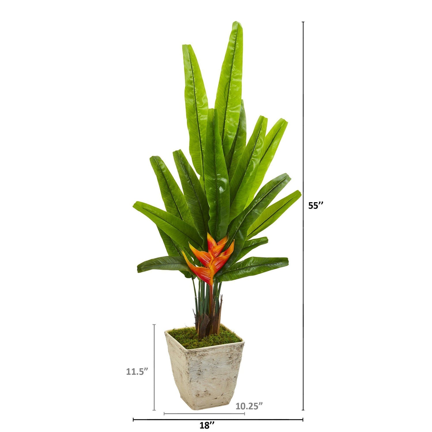 Accentuate bare spaces in your home or office with the help of this artificial travelers palm tree showcasing intricately designed leaves that naturally fan upwards, accented with hints of explosive coloration and detailing. Standing 55” high from a country white planter stabilized with natural moss, this silk tree provides year-round freshness wherever displayed.