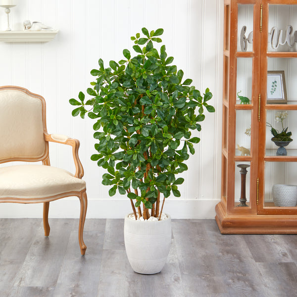 Sip a taste of the exotic Mediterranean landscape with this Black Olive Artificial Tree. So realistic, you’ll be transported to an Italian escape. Bend and shape this faux tree’s 945 olive leaves – that stem from braided trunks – to evoke feelings of a faraway land. Standing at 56", from a white planter (included in height), house in a corner, foyer, or bedroom. Bring different shapes, textures, and depth to spaces that need a fine, gentle touch.