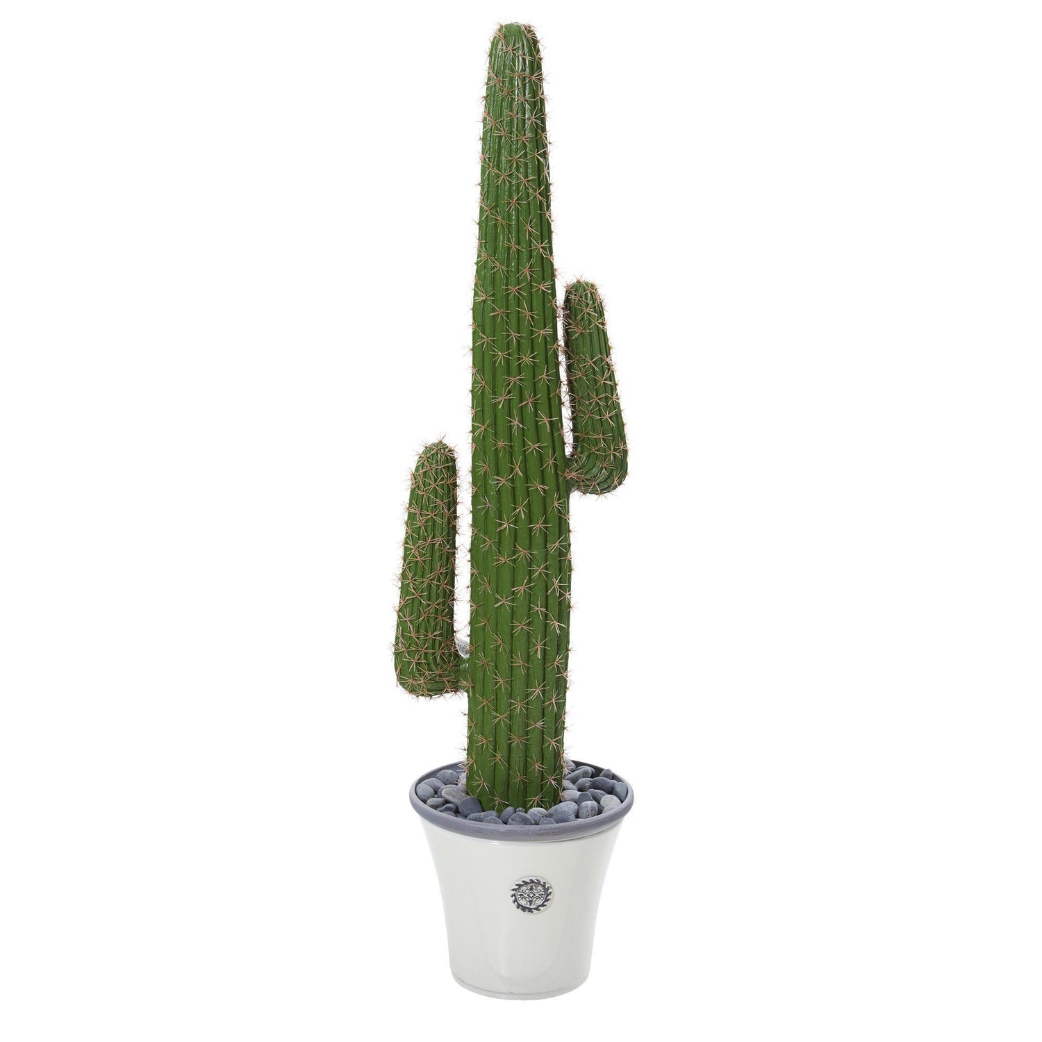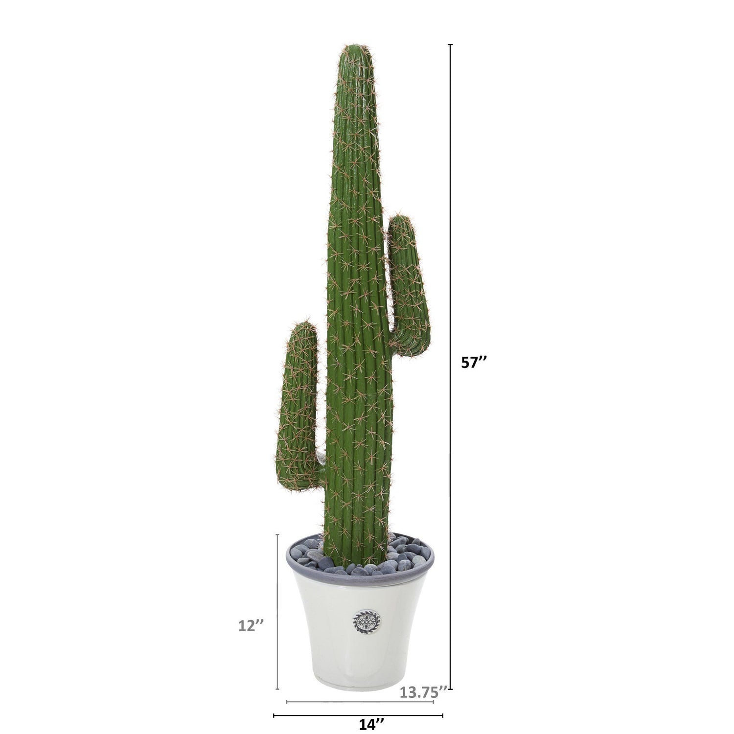Bring texture to tight spaces with this artificial plant boasting a single cactus designed with such realistic color and naturally occurring details that guests will find it hard to believe it’s not real. Standing 57” high from a decorative planter stabilized with river rocks, this fake plant brings the desert’s tranquility indoors without the need for maintenance or upkeep.