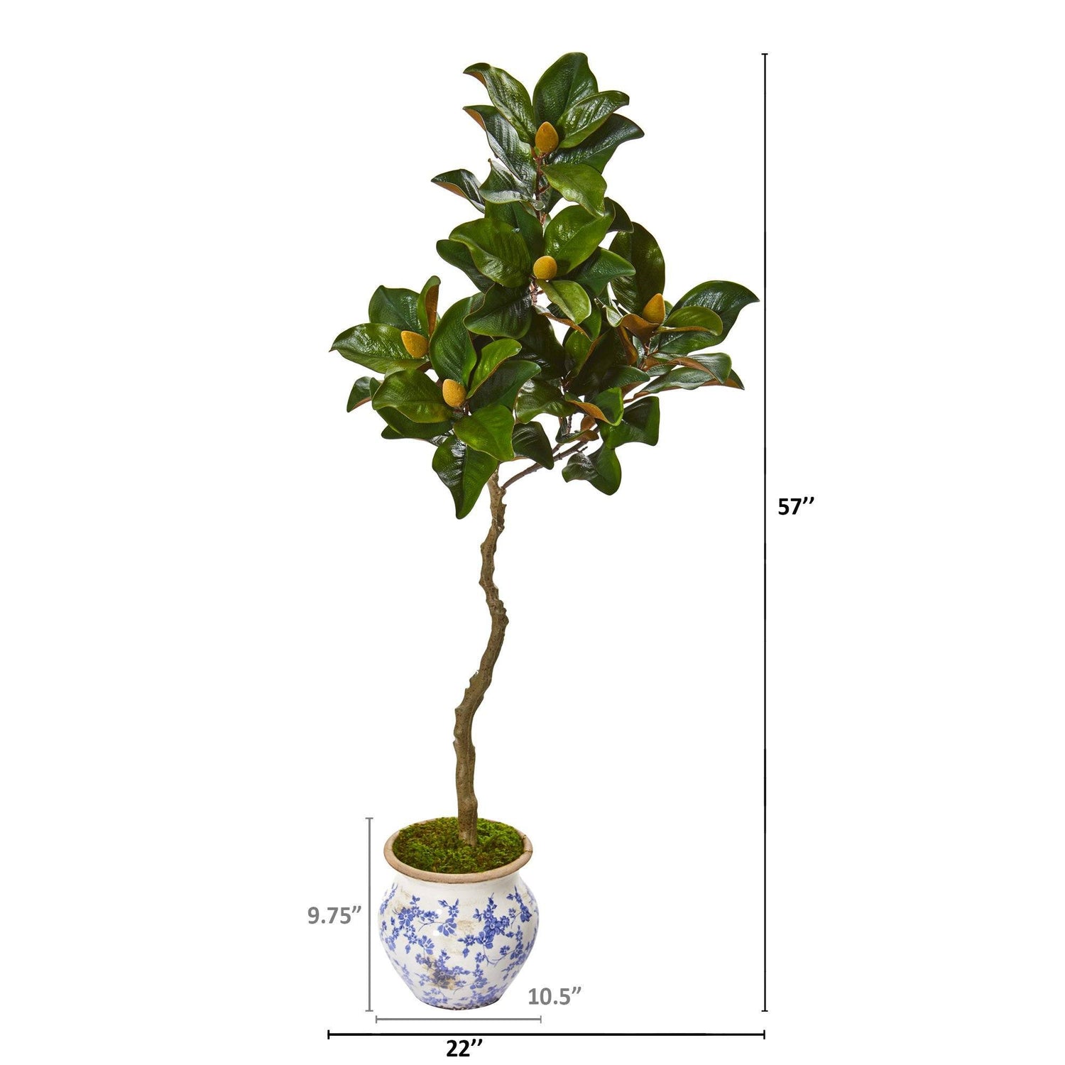 Brighten tight spaces with this artificial magnolia tree flaunting a thick array of brightly colored leaves accented throughout with carefully designed buds. Reaching 57” high from a vintage floral planter, this silk tree requires absolutely no maintenance or upkeep.