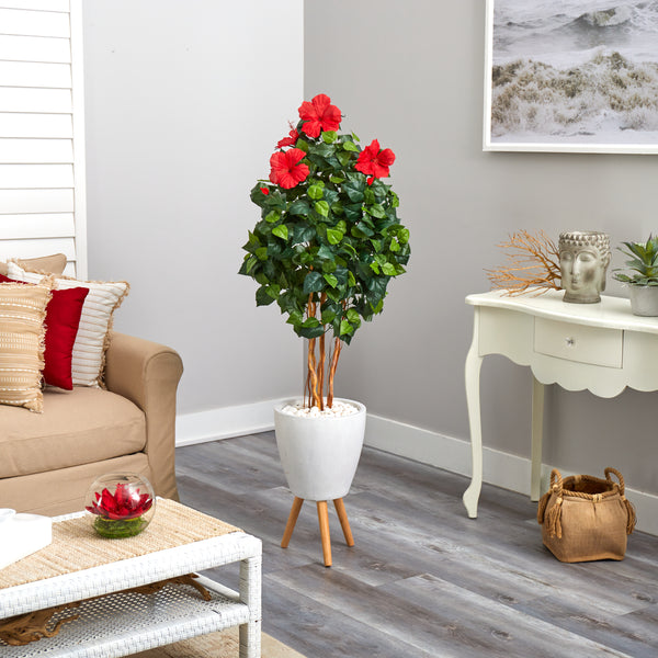 Fancy a sultry vacation? Escape to a tropical destination with this Hibiscus Artificial Tree. A palette of vibrant colored flowers adorn the dark green leaves bringing an exotic touch to spaces in need of a spring / summer refresh. The tripod planter’s legs act as an extension of the thin, twisting brown trunks. Standing 58” from a white planter with stand, curate in tight spaces. Perfect for awkward corners, bathrooms, bedrooms and apartments.